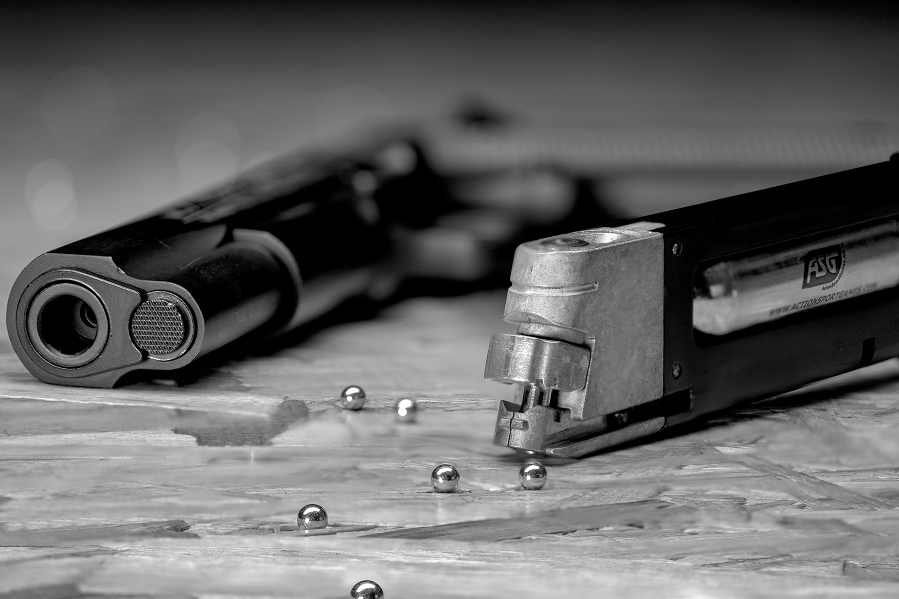 - Vollmetall Pistole mit robusten Griffschalen aus Polymer