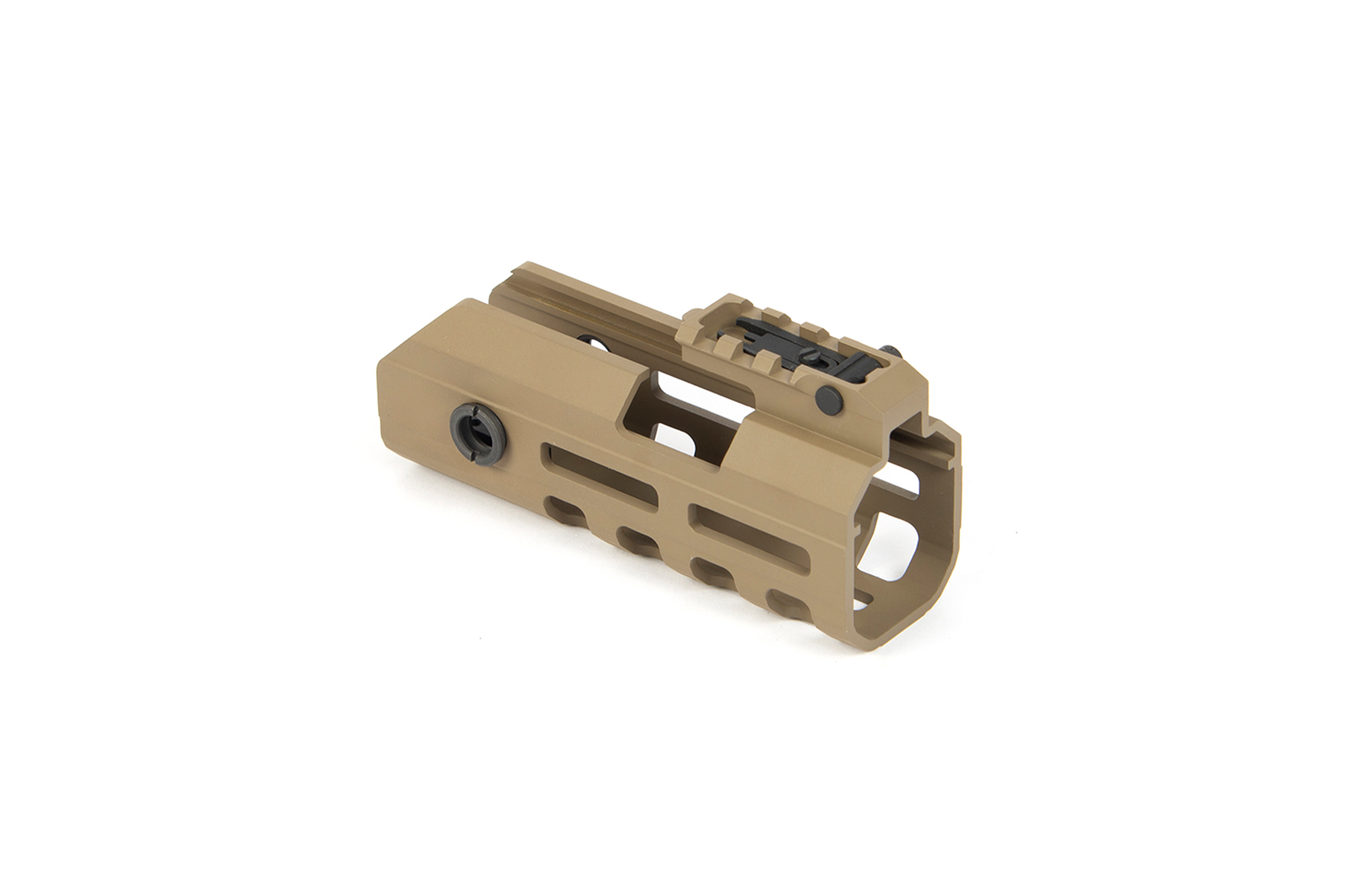 Kurzer Handguard mit M-LOK Öffnungen und kurzer Picatinnyschiene in der Farbe Dark Earth.