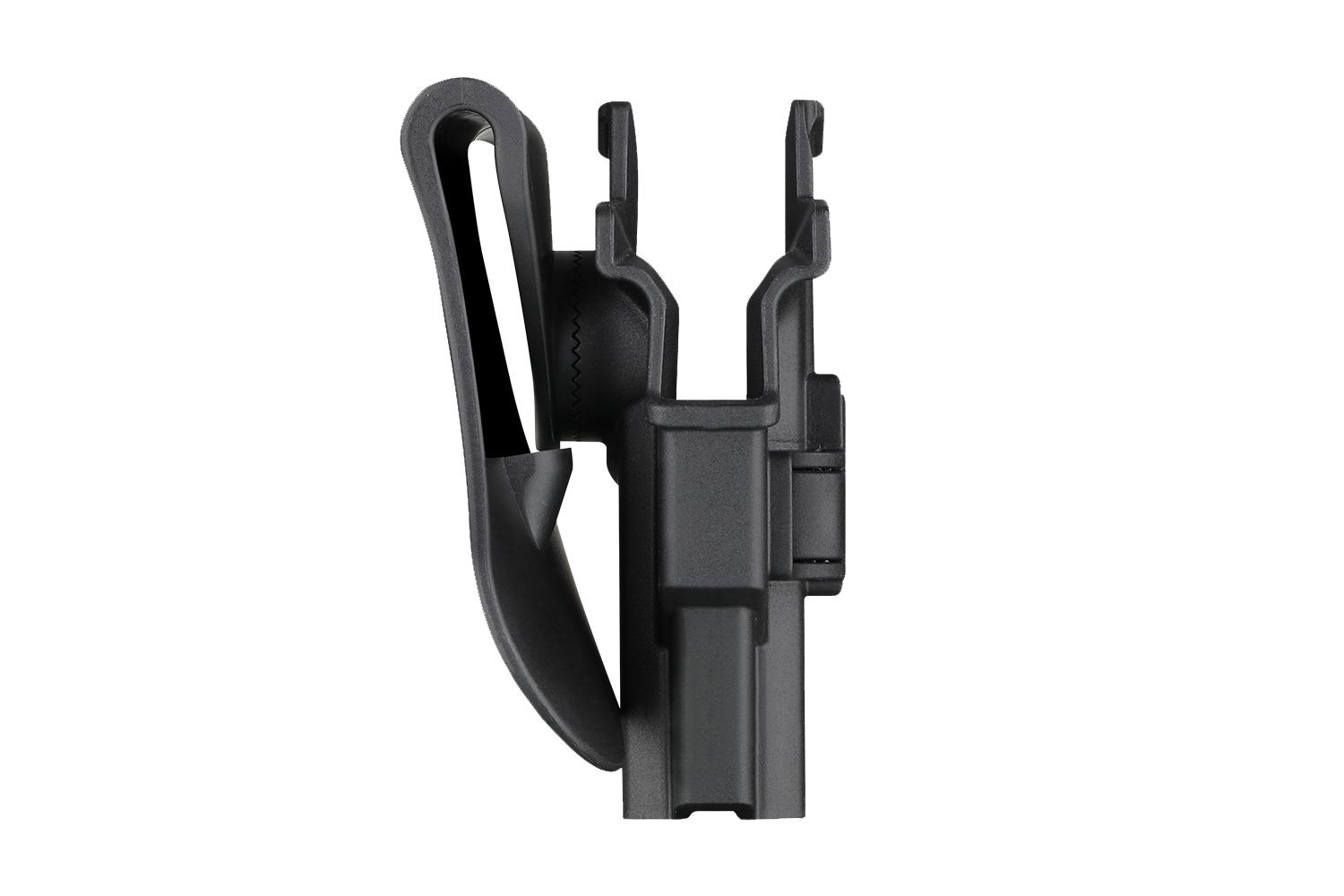 Ein verbauter Mechanismus zur Spannungsjustierung reduziert Schütteln und Schüttelgeräusche. Diese Pistolen Halterung ist auch mit montiertem Red Dot Visier, wie z.B. einem Sig Sauer ROMEO1 PRO nutzbar.