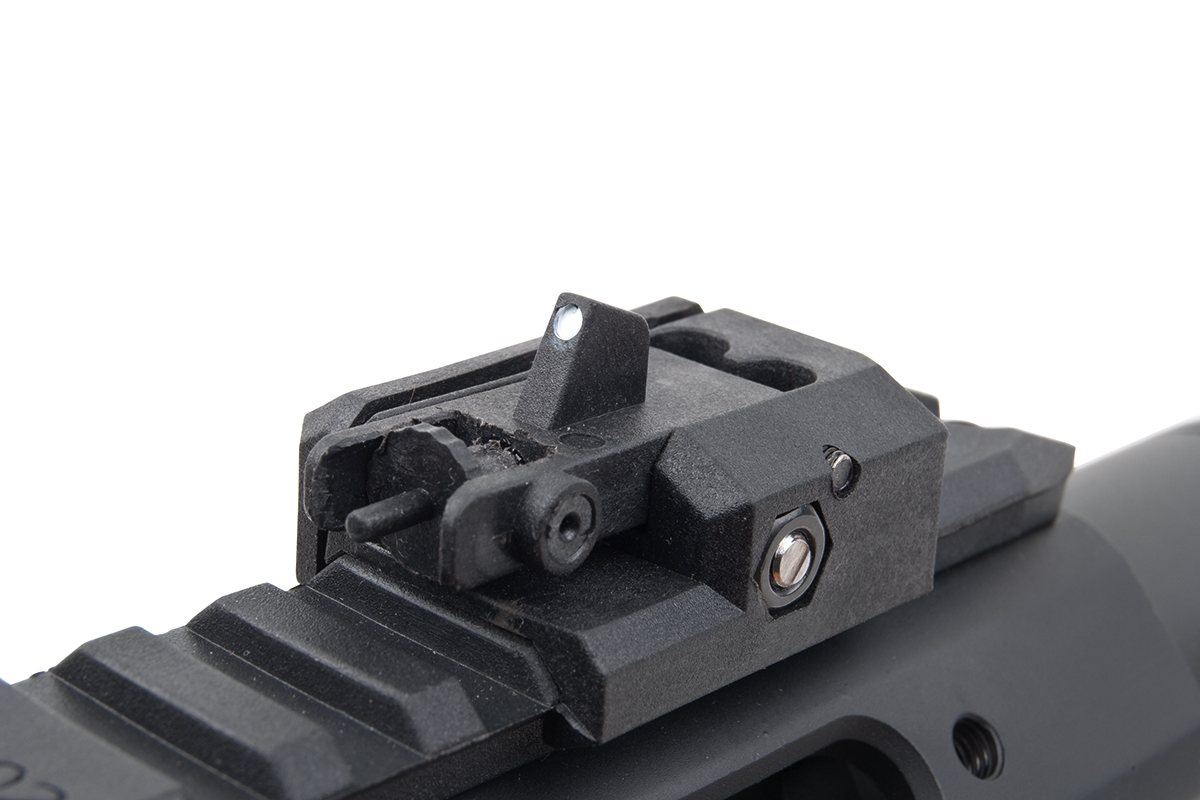 Die M4 015 ist natürlich mit dem beliebten Electronic Firing Control System (EFCS) ausgestattet. An der Unterseite befindet sich eine 6,5 cm Railschiene an der der mitgelieferte Handgriff montiert werden kann. Auf der Oberseite befindet sich ein spezielles R.A.S.-System. Dank der Bohrungen können nach Belieben 21mm Schienen angebracht werden. Perfekt für verschiedenstes Zubehör. Kimme und Korn sind beide klappbar. Das Spin-Up ist leicht einstellbar und befindet sich direkt unter dem Hülsenauswurffenster.
