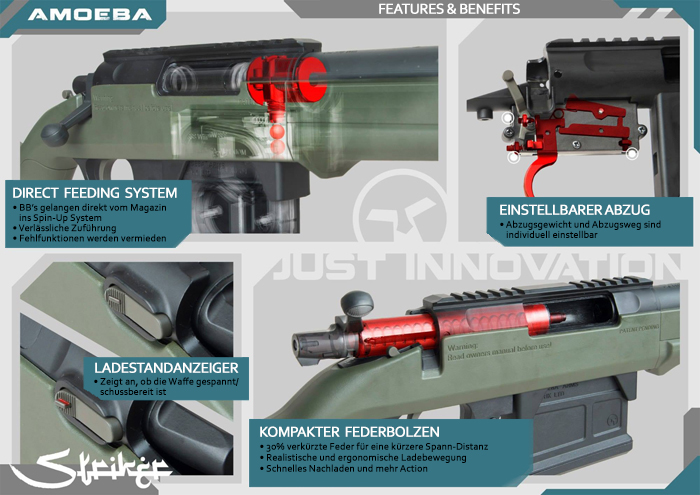 Amoeba Striker S1 Scharfschützengewehr ist ergonomisch und modular aufgebaut. Der Fokus bei der Entwicklung lag auf einem geringen Gewicht und optimaler Wenigkeit. Der hochwertige Polymer-Kunststoff unterstreicht die Modularität des Gewehrs. Viele Teile können individuell ausgetauscht werden (z.B. Wangenauflage, Griffstück, etc.).