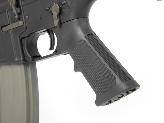 Die hochwertig verarbeitete S-AEG Waffe aus dem Hause ARES verfügt über ein Aluminium R.I.S.-Schienensystem, einen Frontgriff, einen festen Schaft, eine abnehmbare & einstellbare Visierung und ein einstellbares Spin-Up System.