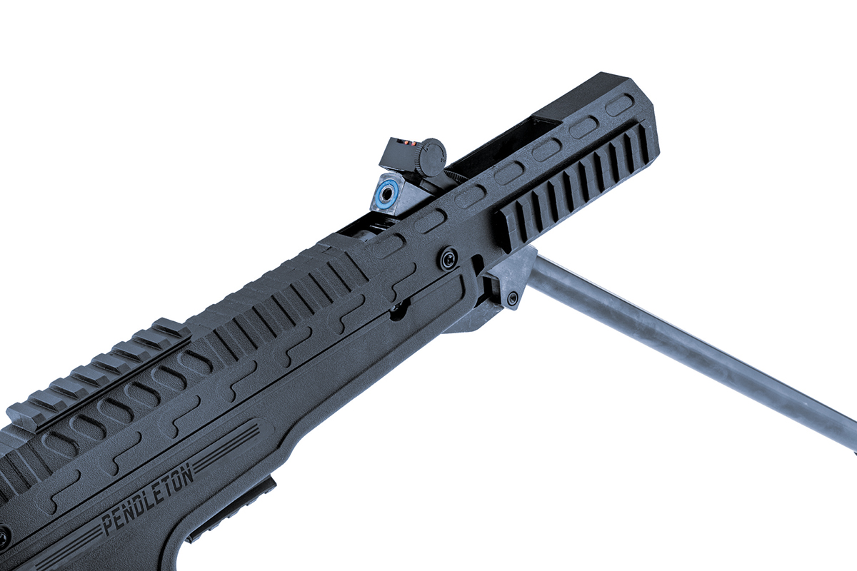 Das wohl außergewöhnlichste an dieser Waffe: Sie verfügt über fünf Picatinny-Schienen. Unter anderem eine 21mm Picatinny-Schiene zur Montage einer Optik, als auch eine Schiene unterhalb des Laufes für ein Zweibein. Die Möglichkeiten für die Anbringung von weiterem taktischen Zubehör sind hier unendlich.