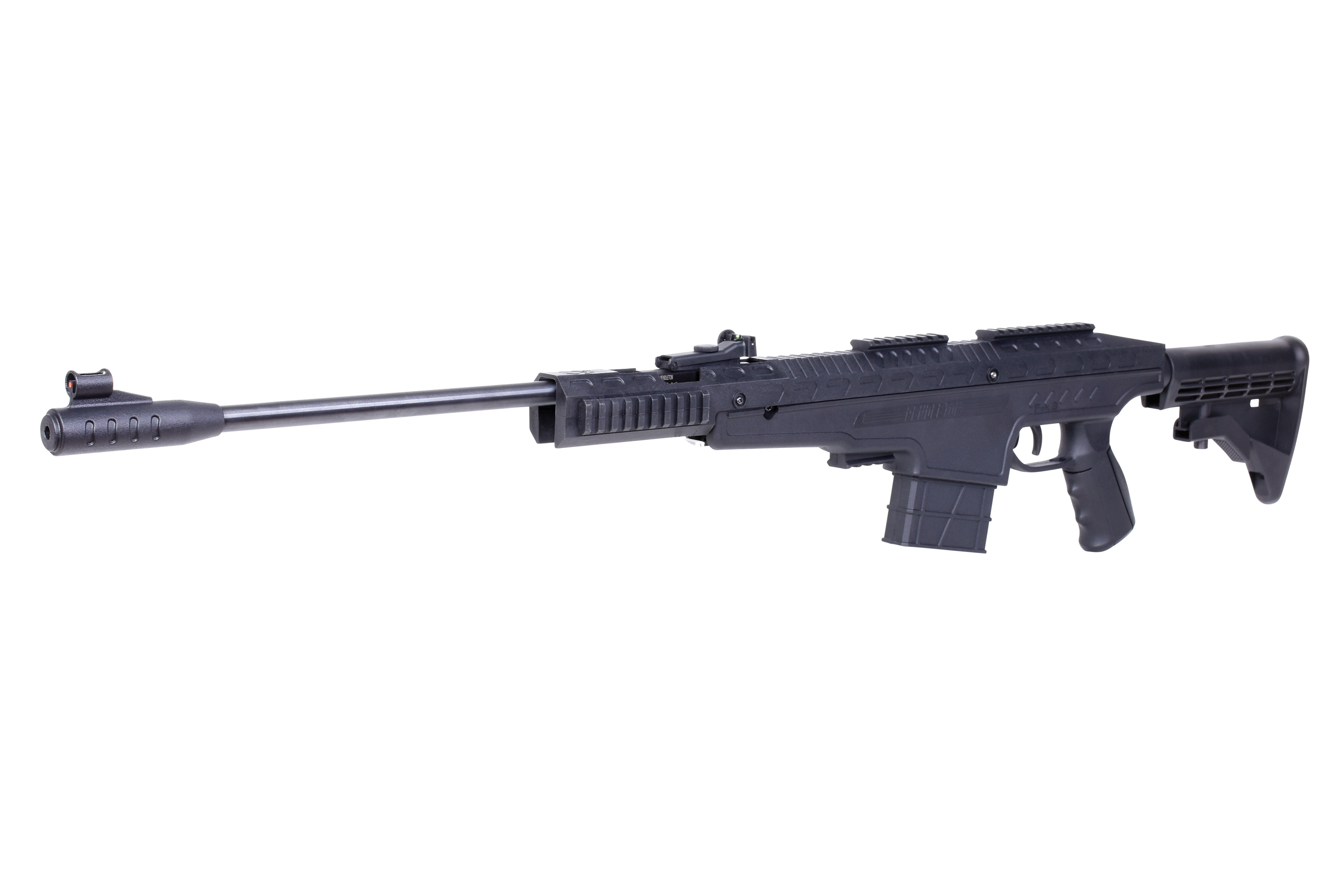 Für zusätzlichen Komfort und festen Halt sorgt der in fünf Stufen verstellbare Teleskop-Schaft im AR-15 Style. Er kann auch nach Belieben durch alle AR-15 Schäfte ausgetauscht werden. Die Fiber Optik mit höhen- und seitenverstellbarer Kimme rundet das Gesamtbild dieses Luftgewehrs ab.