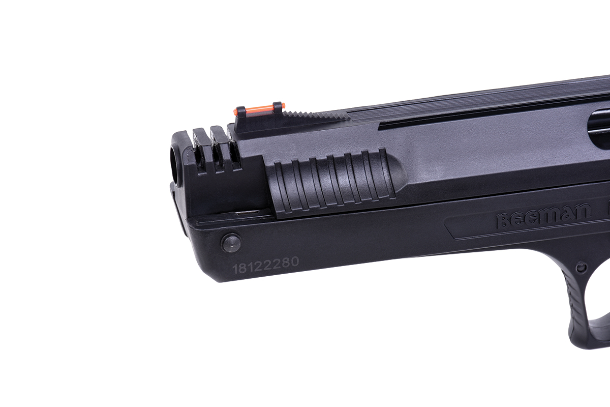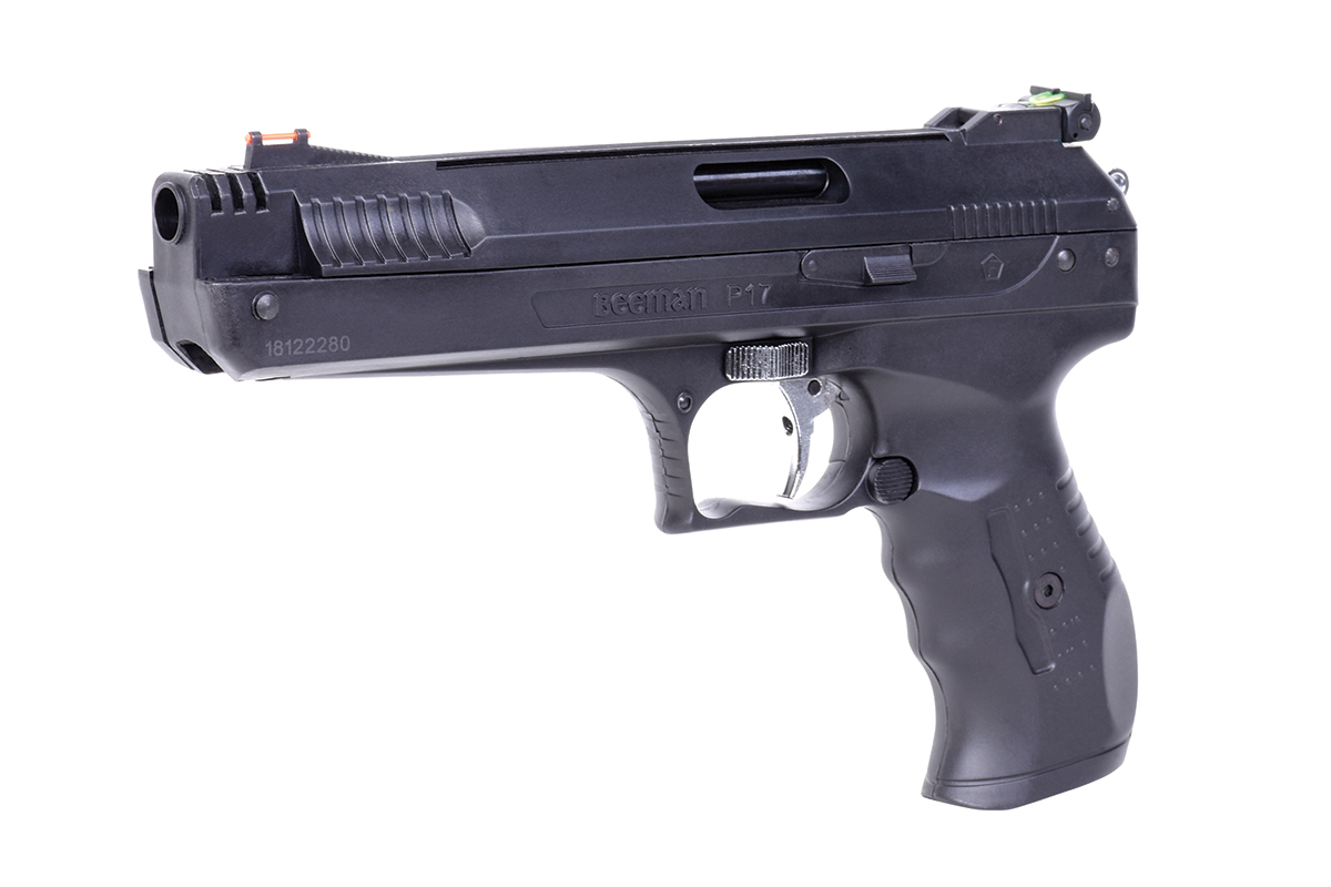 Der Metallabzug ist leichtgängig und einstellbar. Auf der Pistole befindet sich eine verstellbare Fiber Optik Visierung in rot/grün. Eine weitere besondere Eigenschaft ist die automatische Sicherung. Diese klinkt sich beim Öffnen des Laufes selbstständig ein und lässt sich einfach wieder lösen, indem man den Sicherungsknopf direkt über dem Abzugsbügel betätigt. Außerdem verfügt die BEEMAN P17 über eine gefräste 11mm Schiene zur Anbringung von Zubehör.