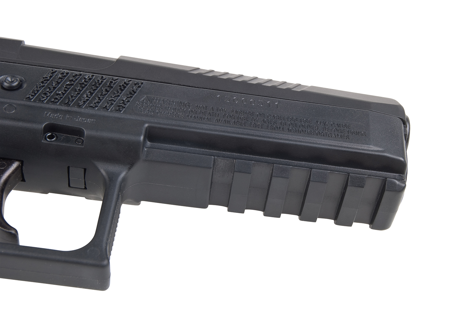 Die hochwertige Replika aus dem Hause ASG ist kompatibel mit 4,5mm Diabolos. Der repetierende Metallschlitten sorgt für ein sehr realistisches Blowback-Erlebnis. Die führige Einsatzpistole verfügt über eine integrierte Railschiene zur Anbringung verschiedener Zubehörteile, einen gezogenen Lauf, eine 3-Punkt-Visierung, eine beidhändige Sicherung, eine individuelle Seriennummer und ein Doppelmagazin mit 2x8 Schuss.