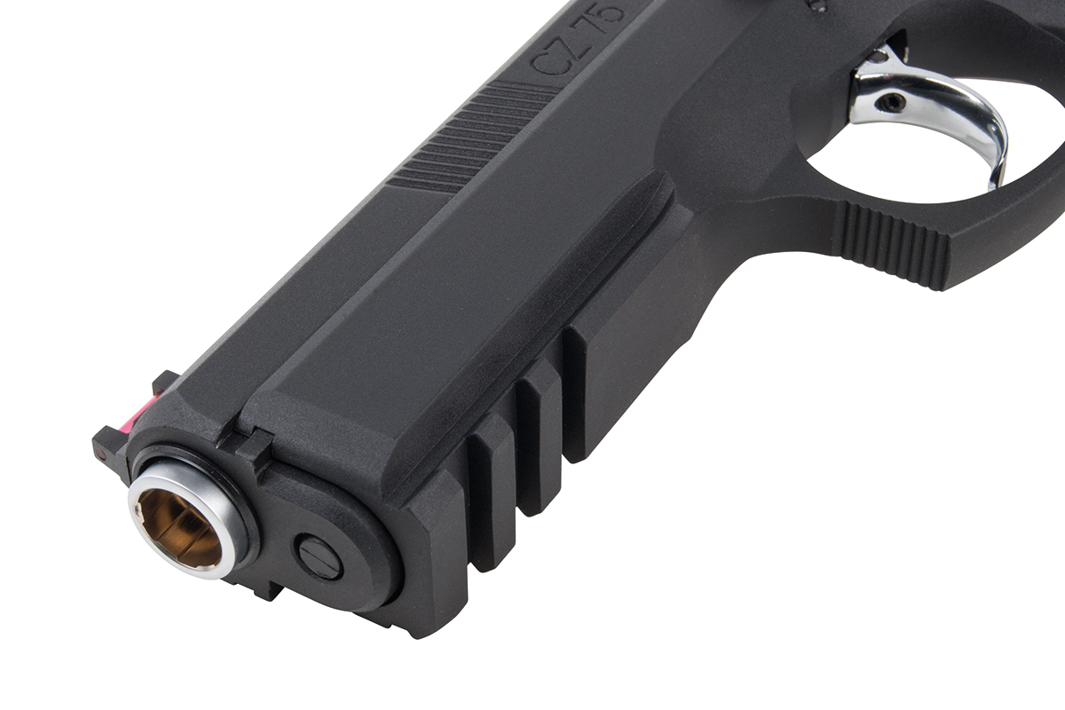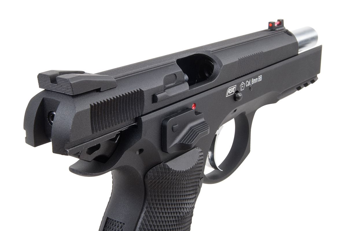Der hochwertige Nachbau aus dem Hause ASG mit einer Energie von ca. 0,9 Joule verfügt über eine Fiberoptic Visierung, eine integrierte Railschiene und ergonomische gummierte Griffschalen. Durch das hohe Gewicht und den repetierenden Schlitten kommt die Waffe dem realen Vorbild sehr nahe. Sie ist eine ausgezeichnete Trainingswaffe und findet Verwendung bei vielen IPSC-Schützen. Der vergrößerte Sicherungshebel ist für Links- und Rechtshänder komfortabel bedienbar.Das einstellbare Hop-Up System sorgt für die nötige Präzision. Die Waffe ist einfach zu Zerlegen und kann auch mit einem optionalen Co2-Magazin betrieben werden.