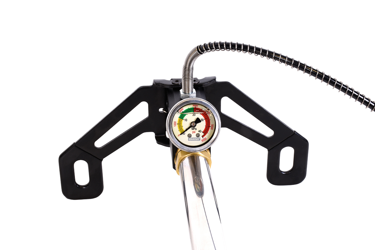 Die Handpumpe verfügt über einen 1/8'' BSP Schnellfüll-Adapter, einen klappbaren Standfuß und ein Manometer mit fluoreszierender Flüssigkeit.