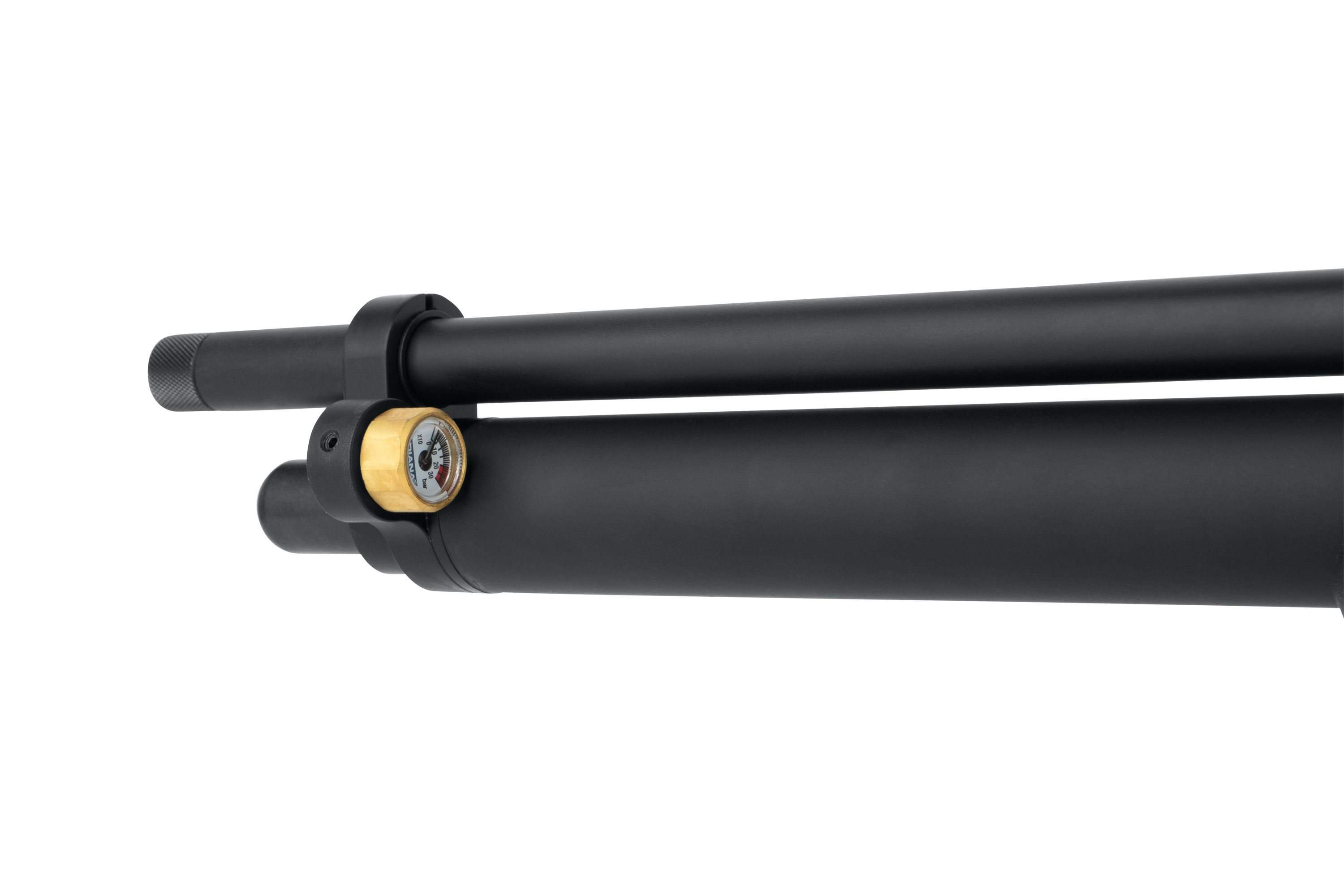 Das rotierbare Manometer ermöglicht eine direkte Druckkontrolle während des Schießens, ohne den Blick vom Ziel zu nehmen. Ein zweites Manometer für den Regulatordruck befindet sich bequem erreichbar an der rechten Seite des Gewehrs.