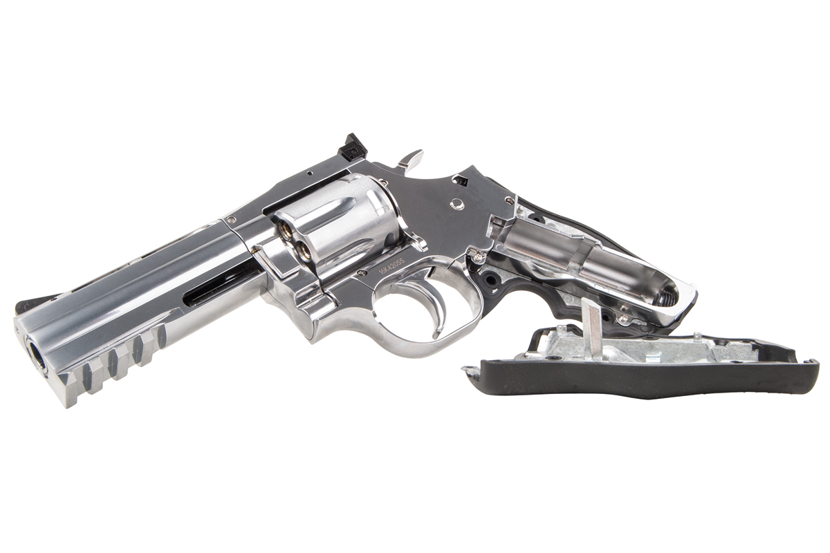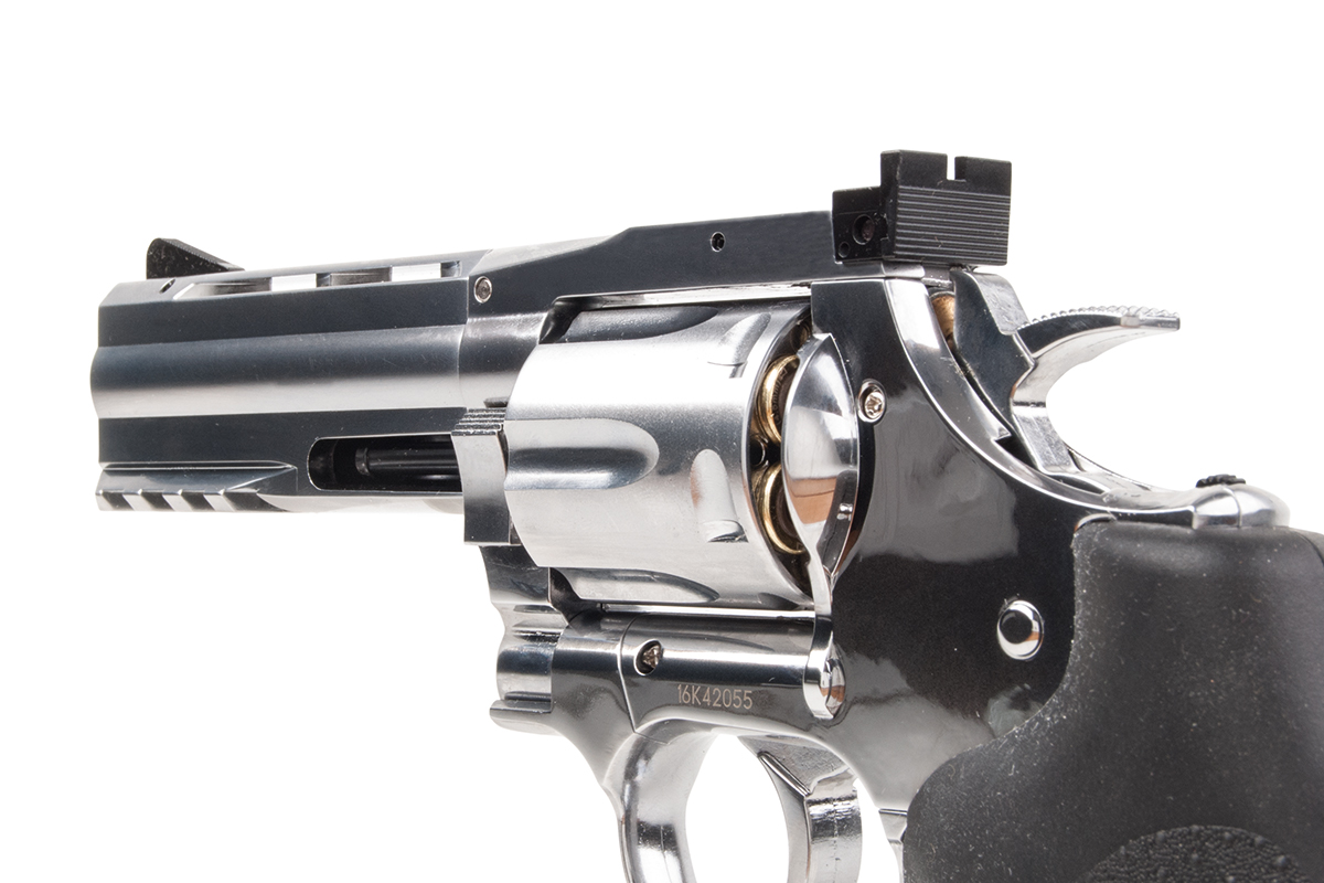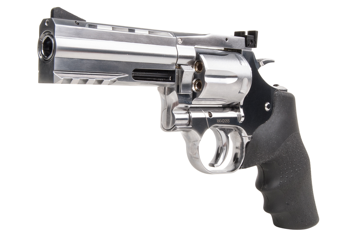 Der hochwertig verarbeitete Nachbau aus dem Hause ASG in Kaliber 4,5mm Diabolo wird mit CO2 betrieben. Der Revolver aus Vollmetall verfügt über eine individuelle Seriennummer, einen gezogenen Lauf, einen Double Action Abzug, eine verstellbare Visierung und ein gummiertes Griffstück im Hogue Design. Im Lieferumfang sind ein Speedloader und 6 Hülsen enthalten. Im Griffstück befindet sich zusätzlich ein Innensechskantschlüssel, mit welchem die Co2-Kapsel ganz einfach zu installieren ist.