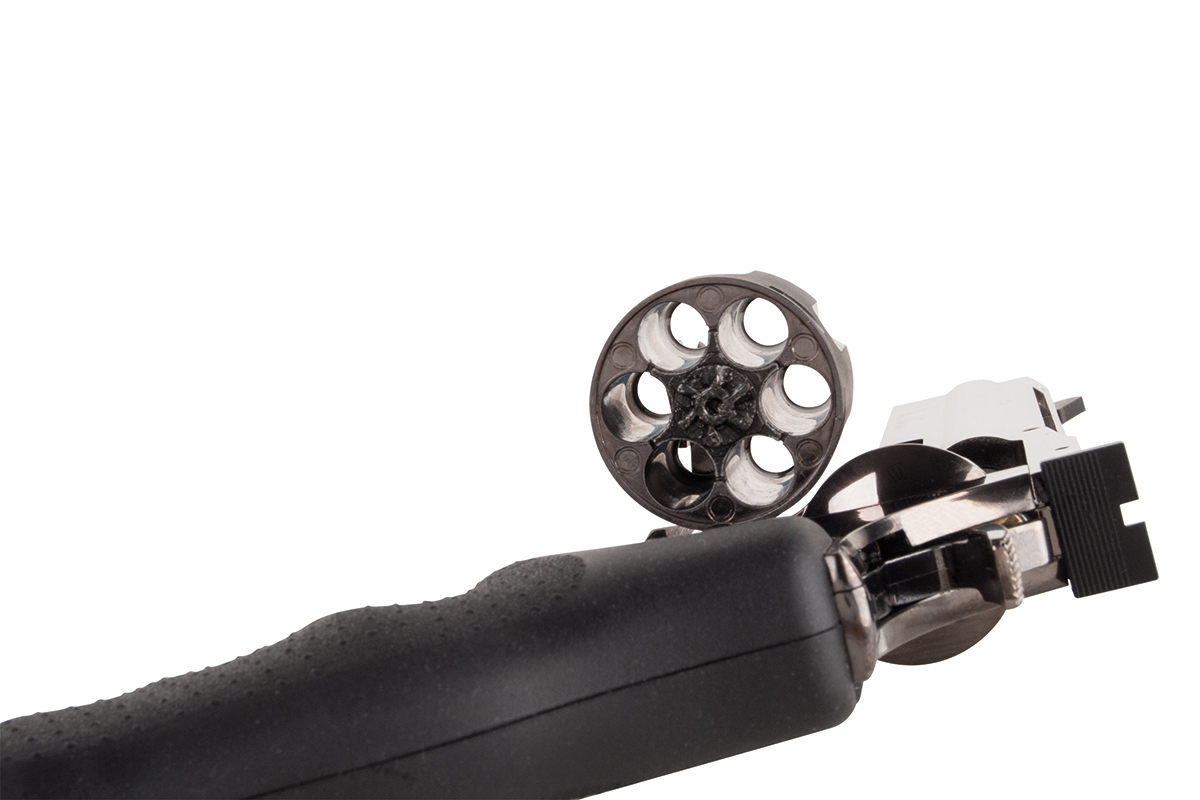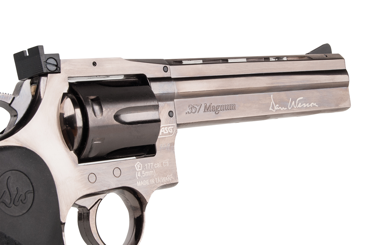 Der hochwertig verarbeitete Nachbau aus dem Hause ASG in Kaliber 4,5mm Diabolo wird mit CO2 betrieben. Der Revolver aus Vollmetall verfügt über eine individuelle Seriennummer, einen gezogenen Lauf, einen Double Action Abzug, eine verstellbare Visierung und ein gummiertes Griffstück im Hogue Design. Im Lieferumfang sind ein Speedloader und 6 Hülsen enthalten. Im Griffstück befindet sich zusätzlich ein Innensechskantschlüssel, mit welchem die Co2-Kapsel ganz einfach zu installieren ist.