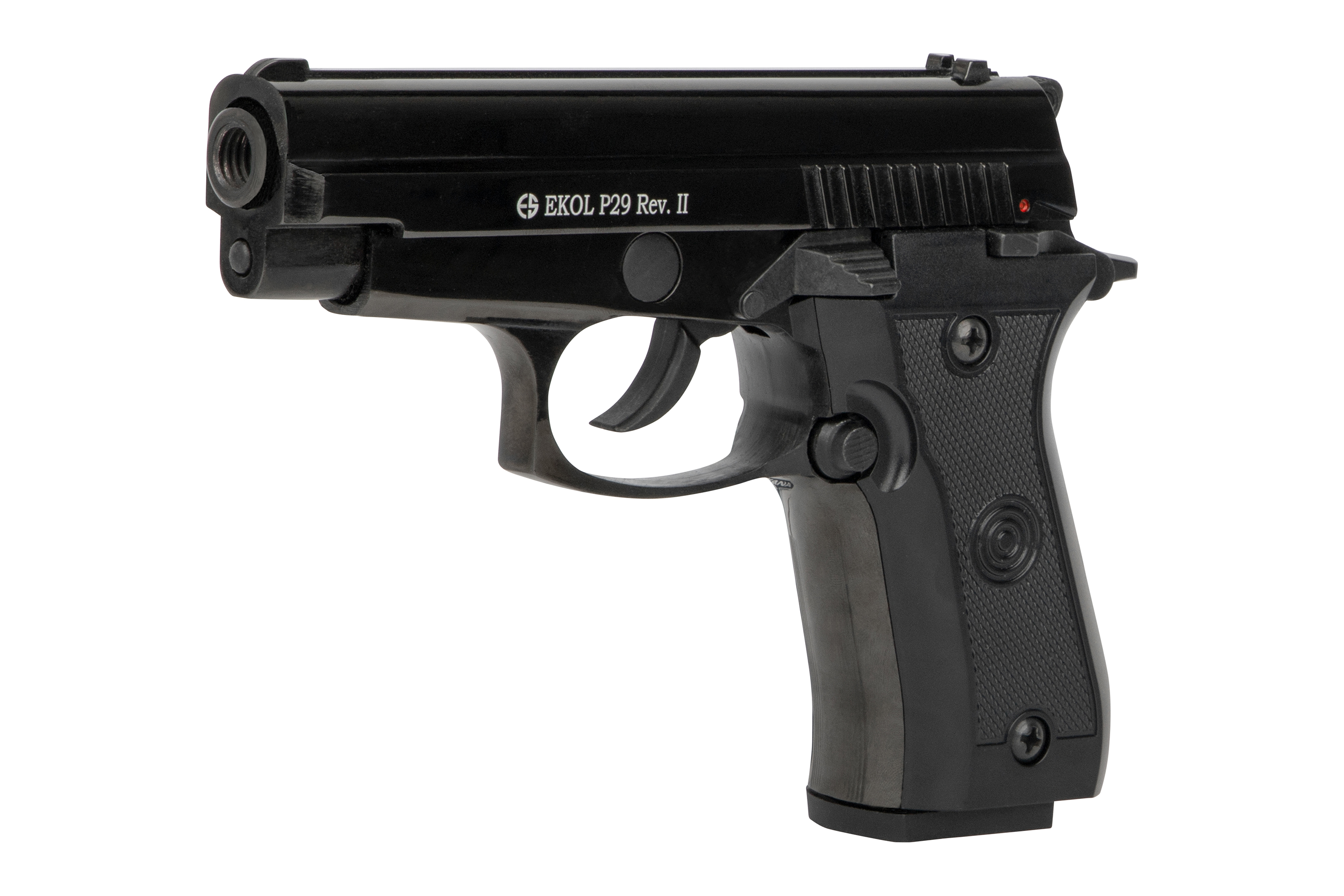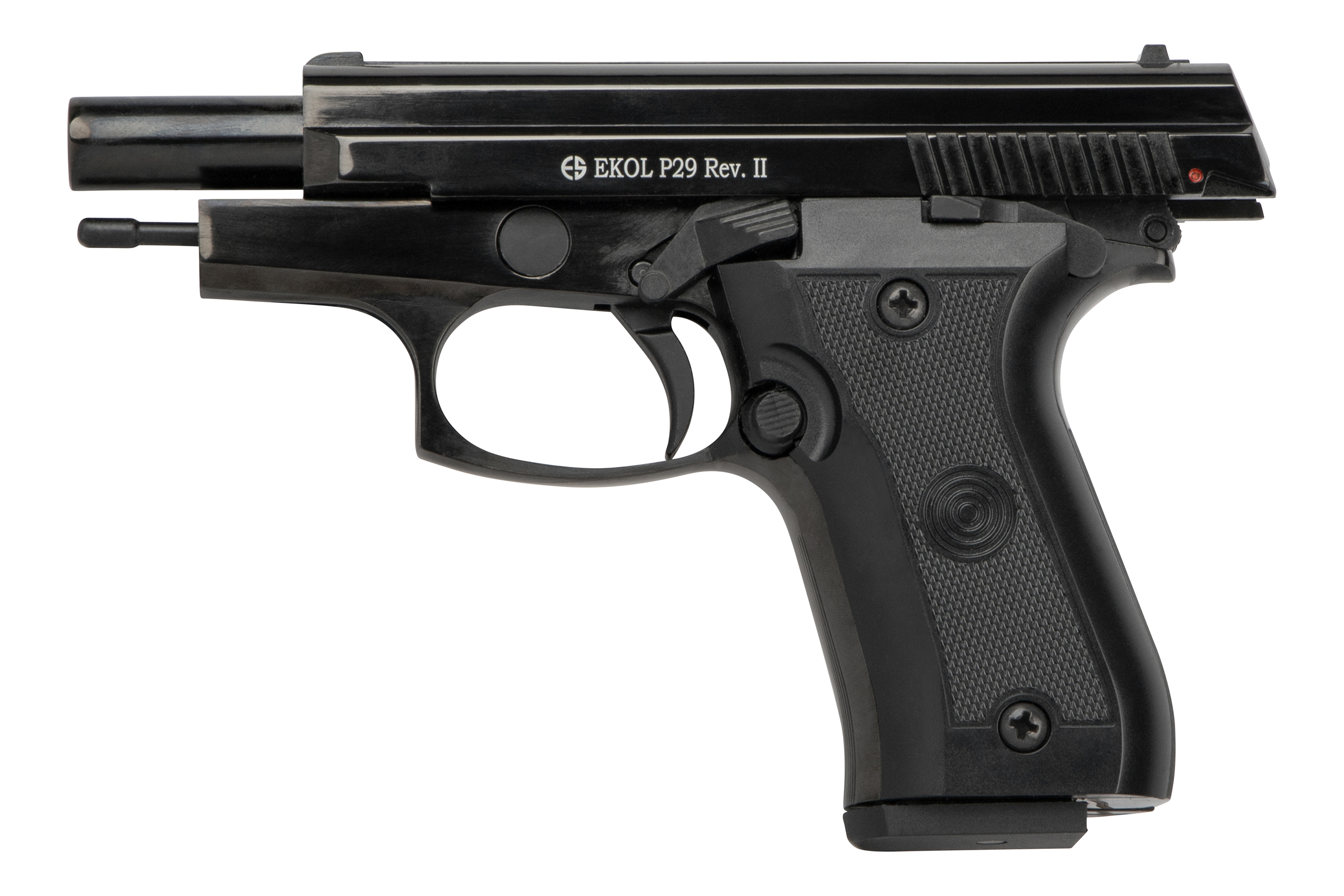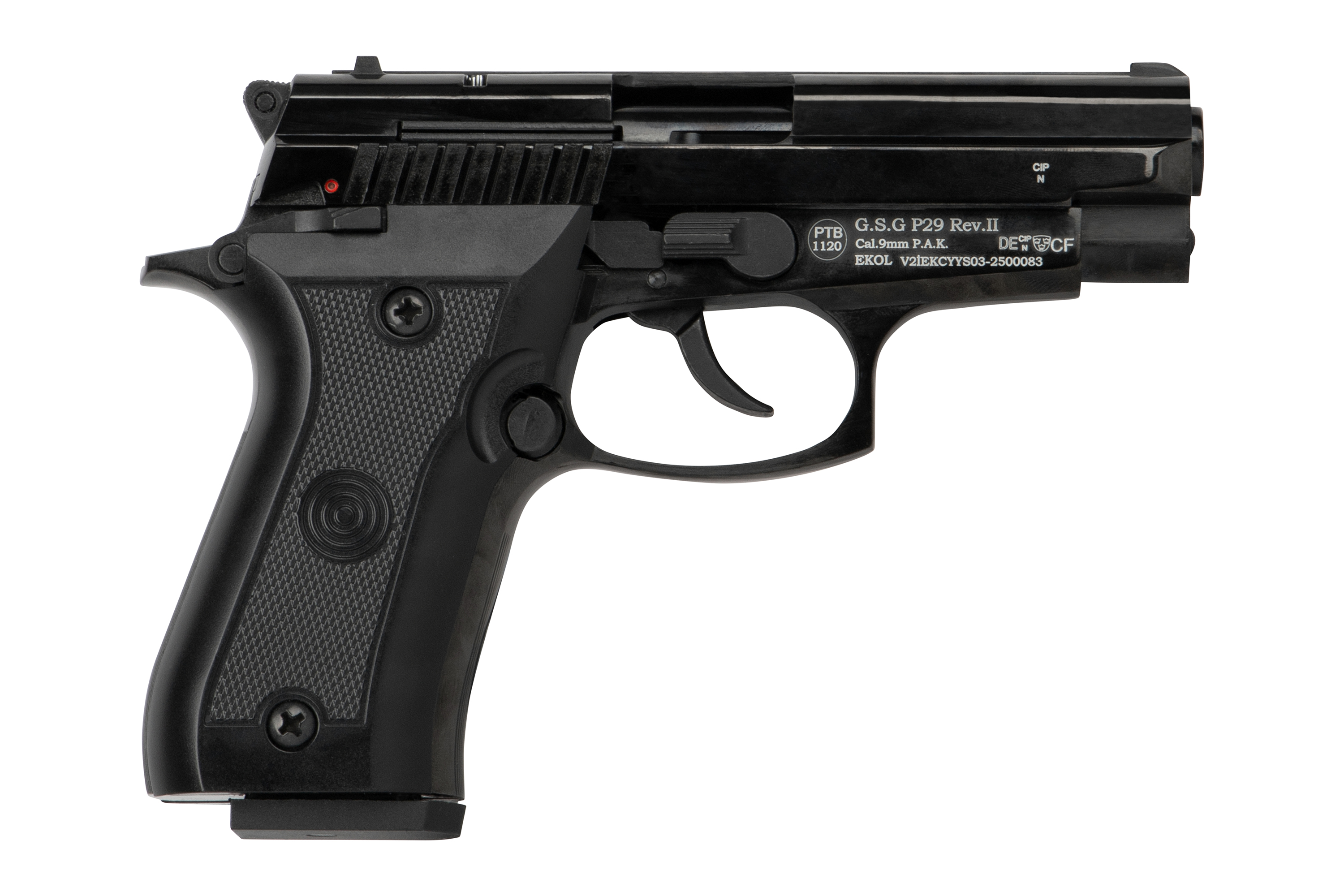 Die Ekol P29 ist eine zuverlässige Gas-Signal-Pistole im Kaliber 9mm P.A.K., die sich durch ihre kompakte Bauweise, hochwertige Verarbeitung und realistische Handhabung auszeichnet. Mit ihrem klassischen Design und der robusten Konstruktion eignet sie sich perfekt für den Einsatz an Silvester, zur Selbstverteidigung mit Gas- oder Pfefferpatronen sowie für Signalmunition.