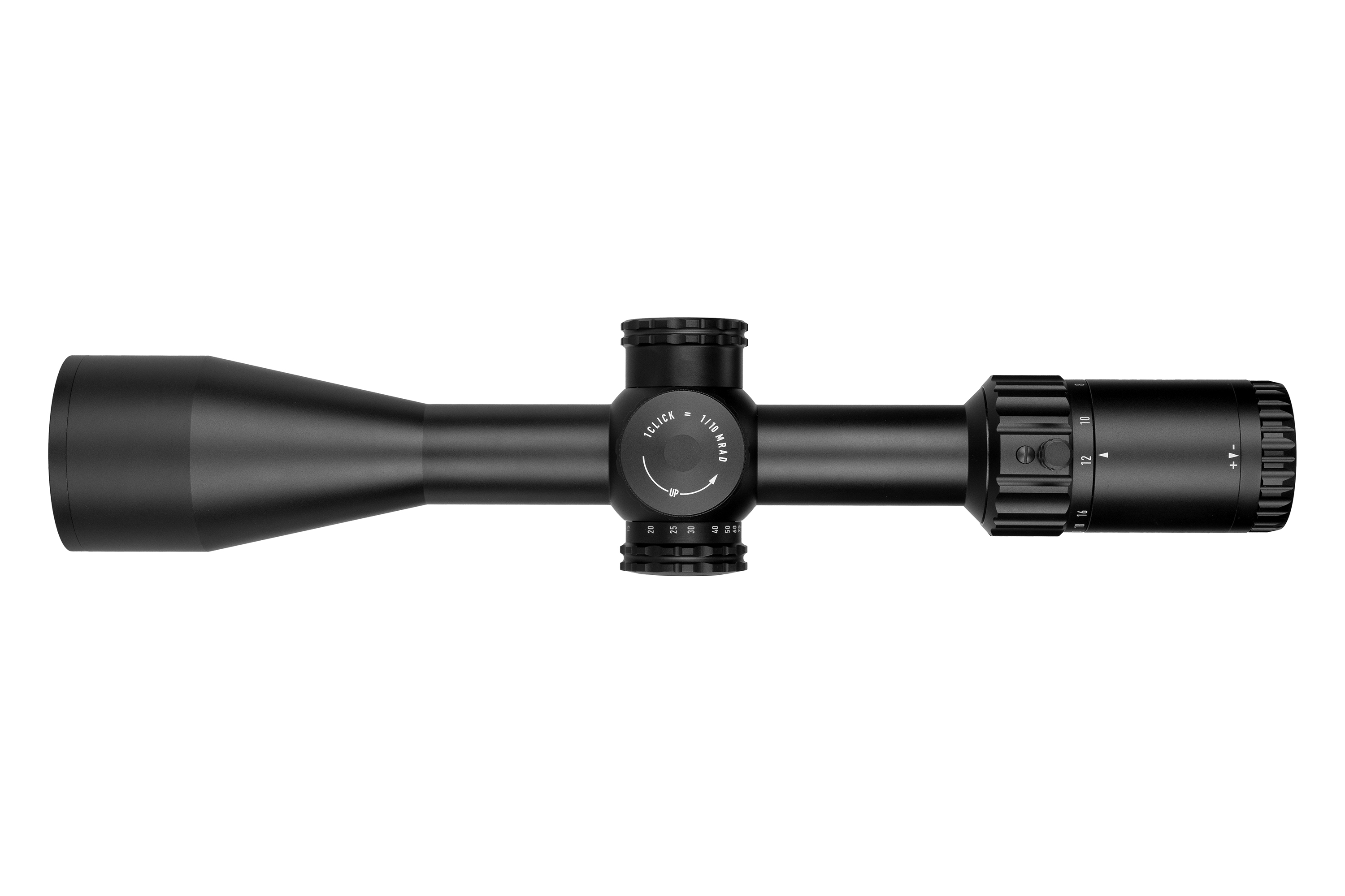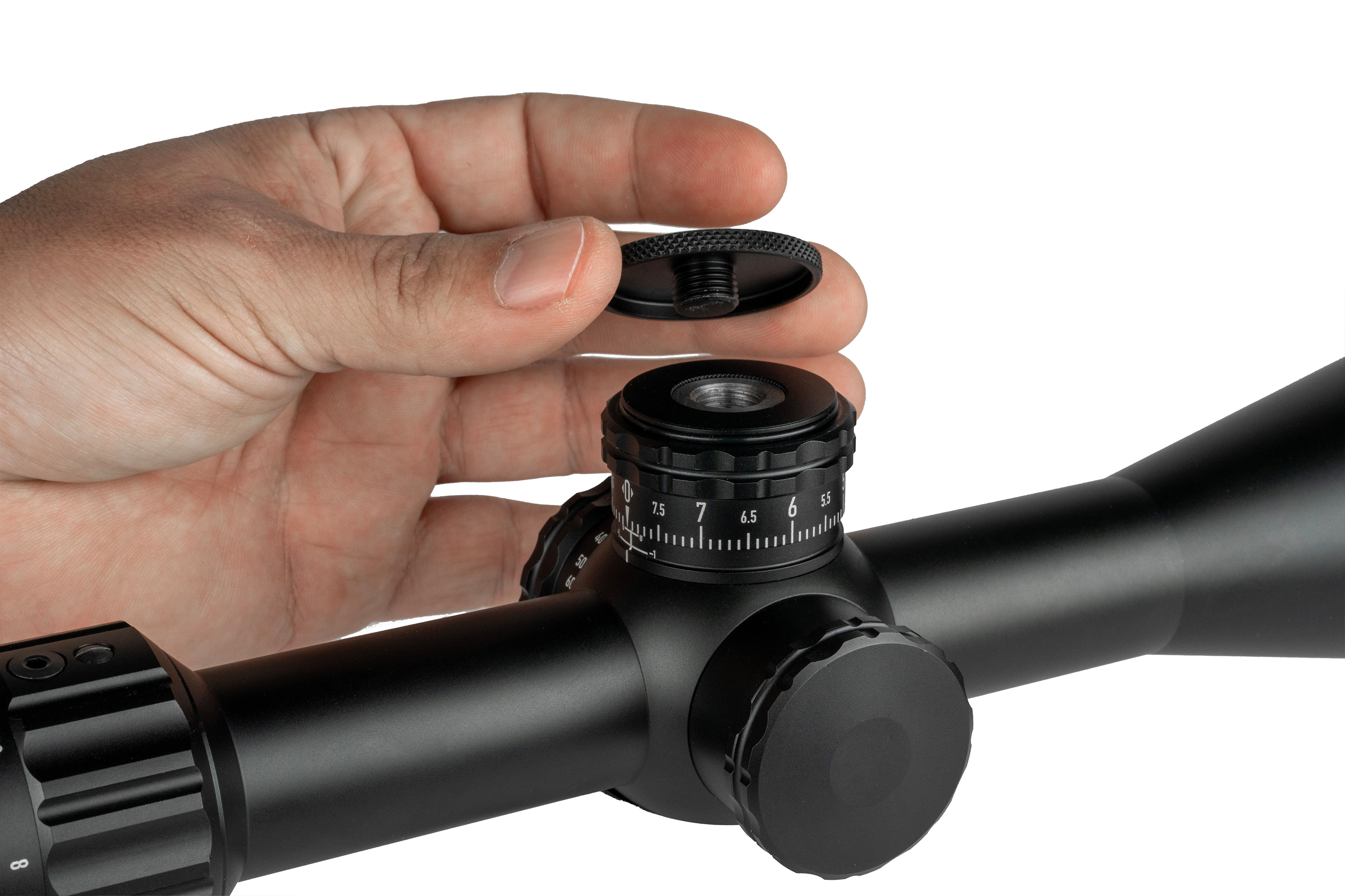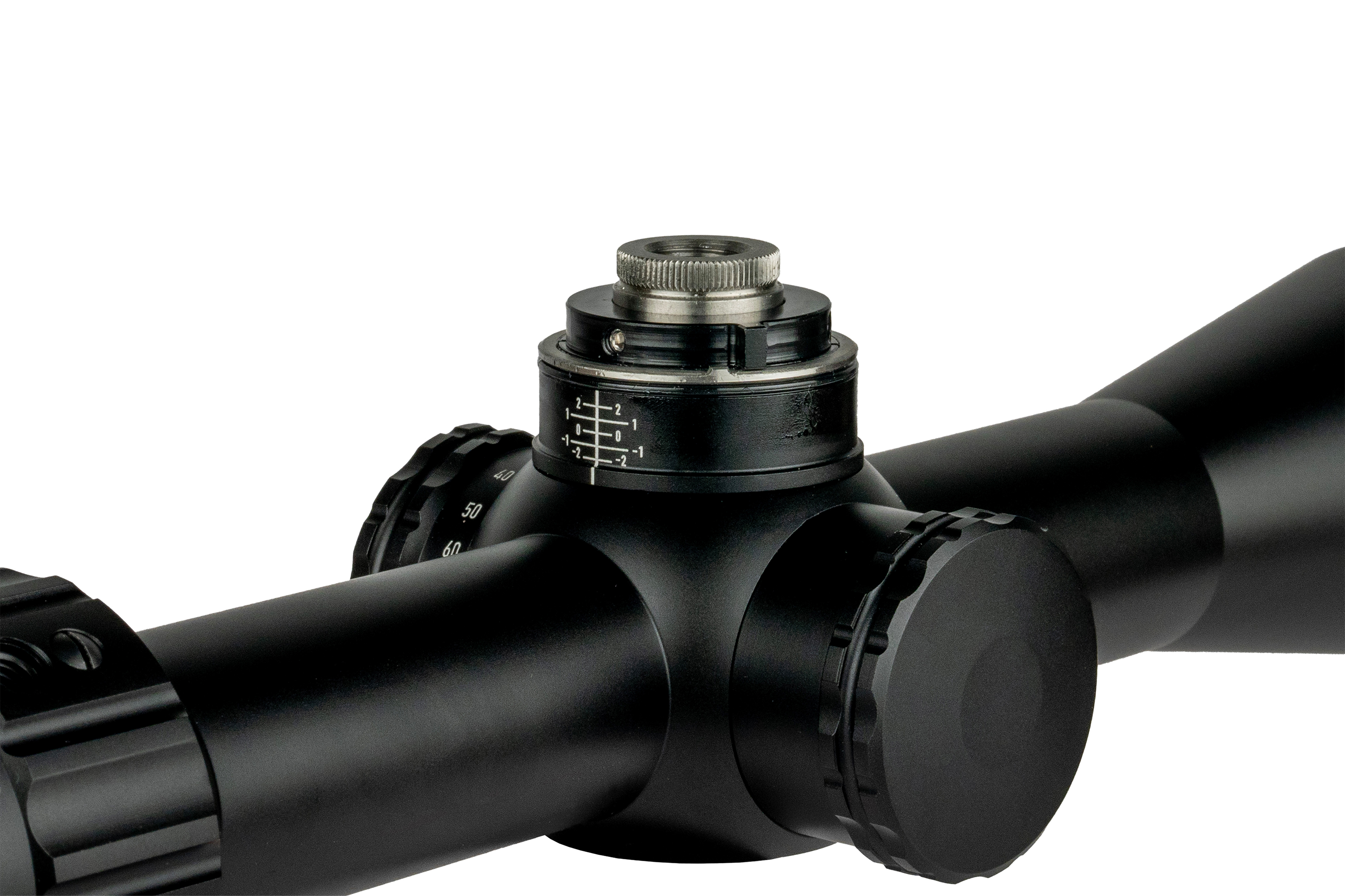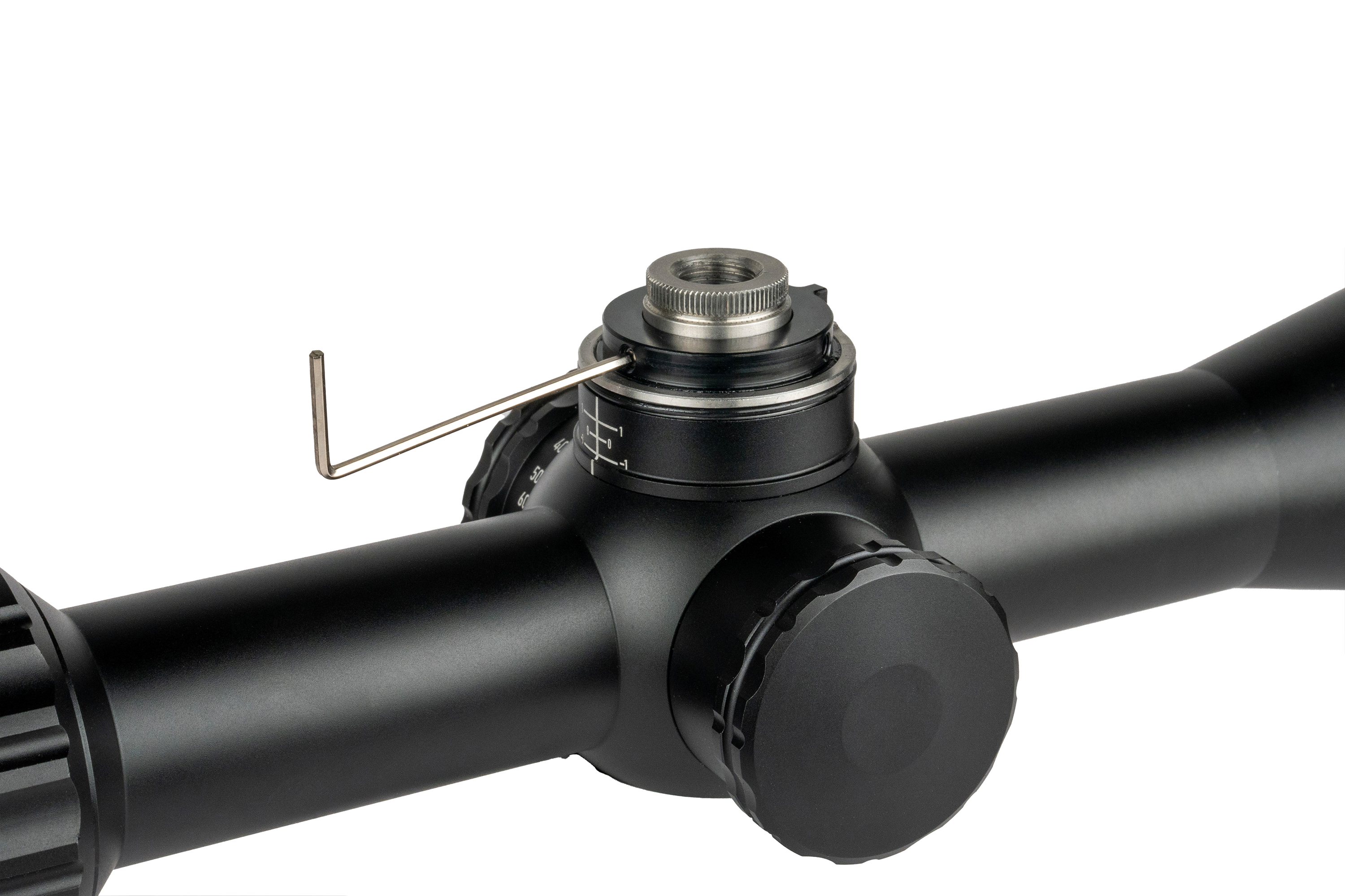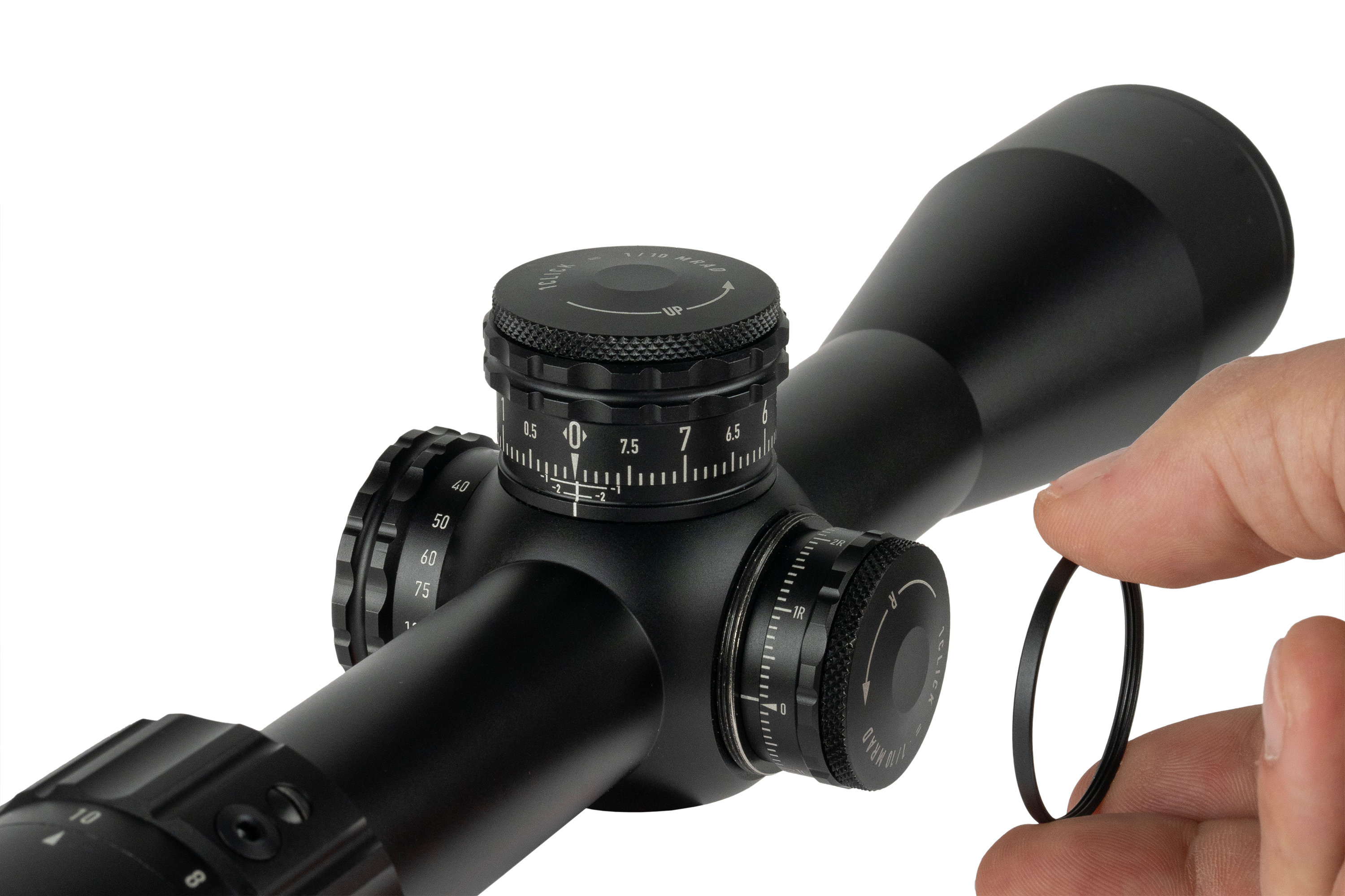 Neues Design mit verbessertem Klickgefühl, größerem Durchmesser (8 MRAD / 20 MOA pro Umdrehung) und niedrigerem Profil. Der Höhenturm bleibt offen mit Zero-Stop, der Seitenturm ist mit einem Gewindeschutzring versehen. - Inklusive Blendenring