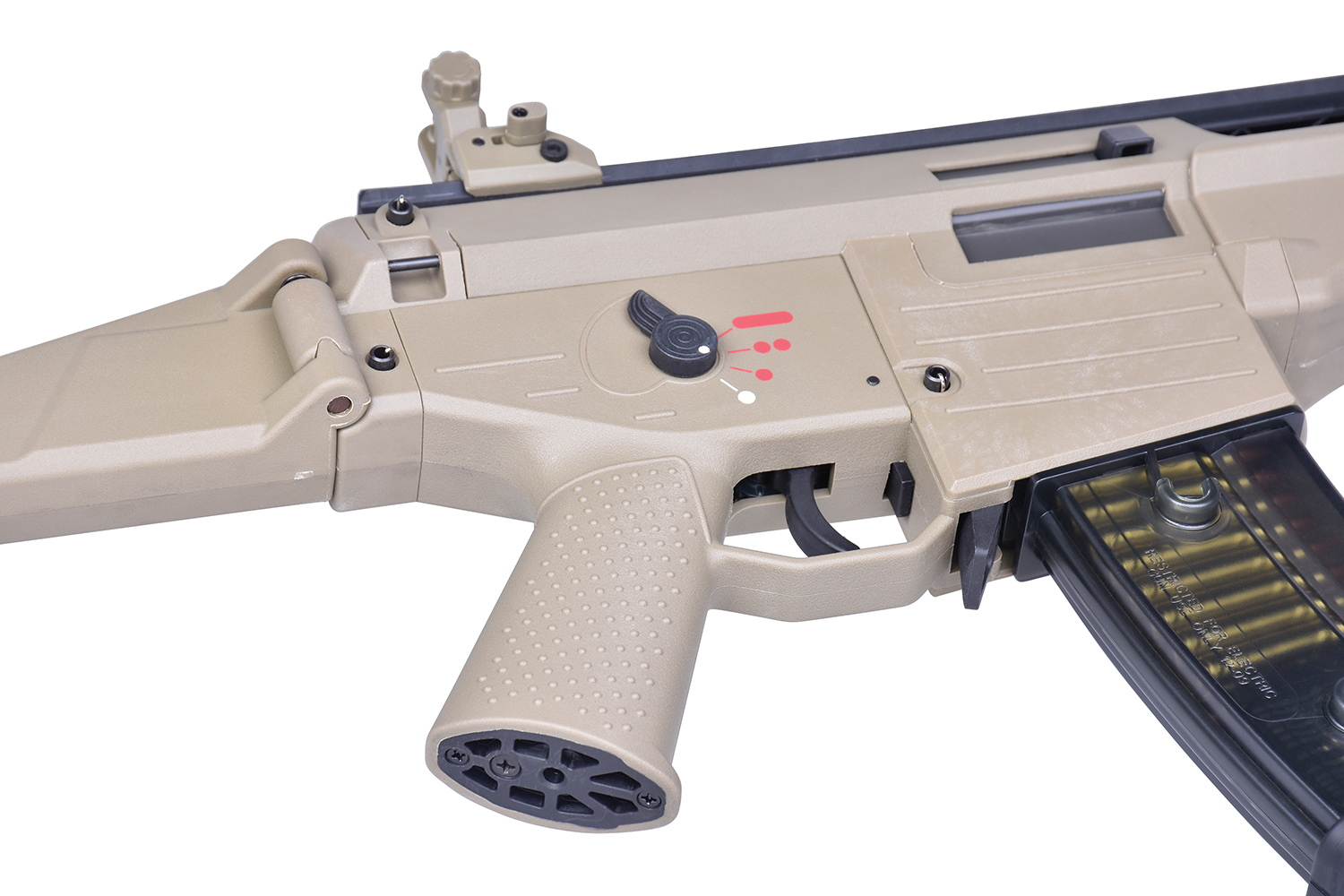 Weiterhin bietet das Modell einen neu designten Klappschaft mit verstellbarer Schulterstütze, eine einstellbare Flip-Up Visierung, ein Anti-Slip Griffstück und ein einstellbares Hop-Up System für ein optimiertes Trefferbild.
