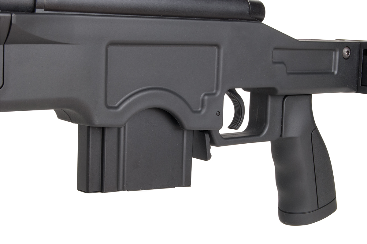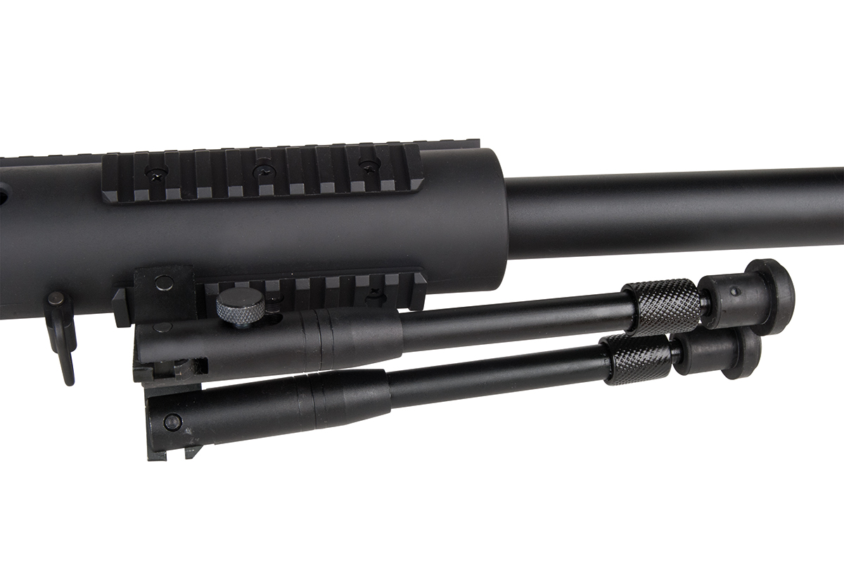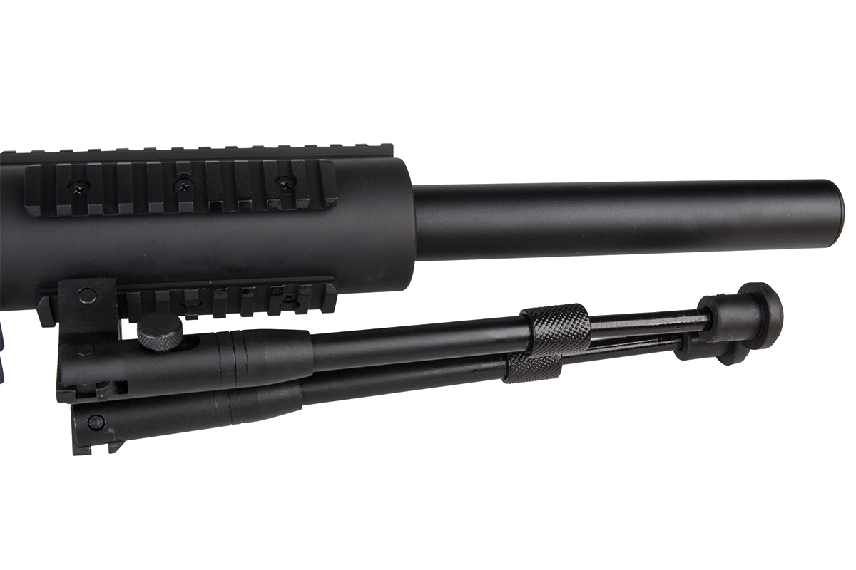 Das hochwertige Sniper-Gewehr aus dem Hause WELL mit einer Energie von ca. 1,7 Joule verfügt über eine einklappbare Schulterstütze, ein integriertes Zweibein, einen Tragegurt, einen Speedloader, eine höhenverstellbare Wangenauflage und verschiedene Railschienen. Gefertigt wird das Mododell aus Metall (Hauptgehäuse, Lauf & R.I.S.-System) sowie aus Kunststoff. Das bewährte Spin-Up System sorgt für Präzision auf höchstem Niveau. Die Lieferung erfolgt inklusive passendem Zielfernrohr.
