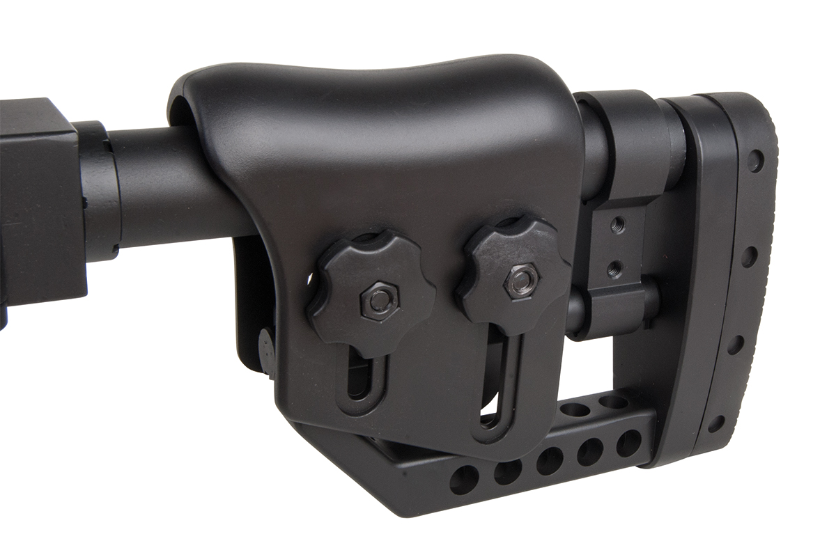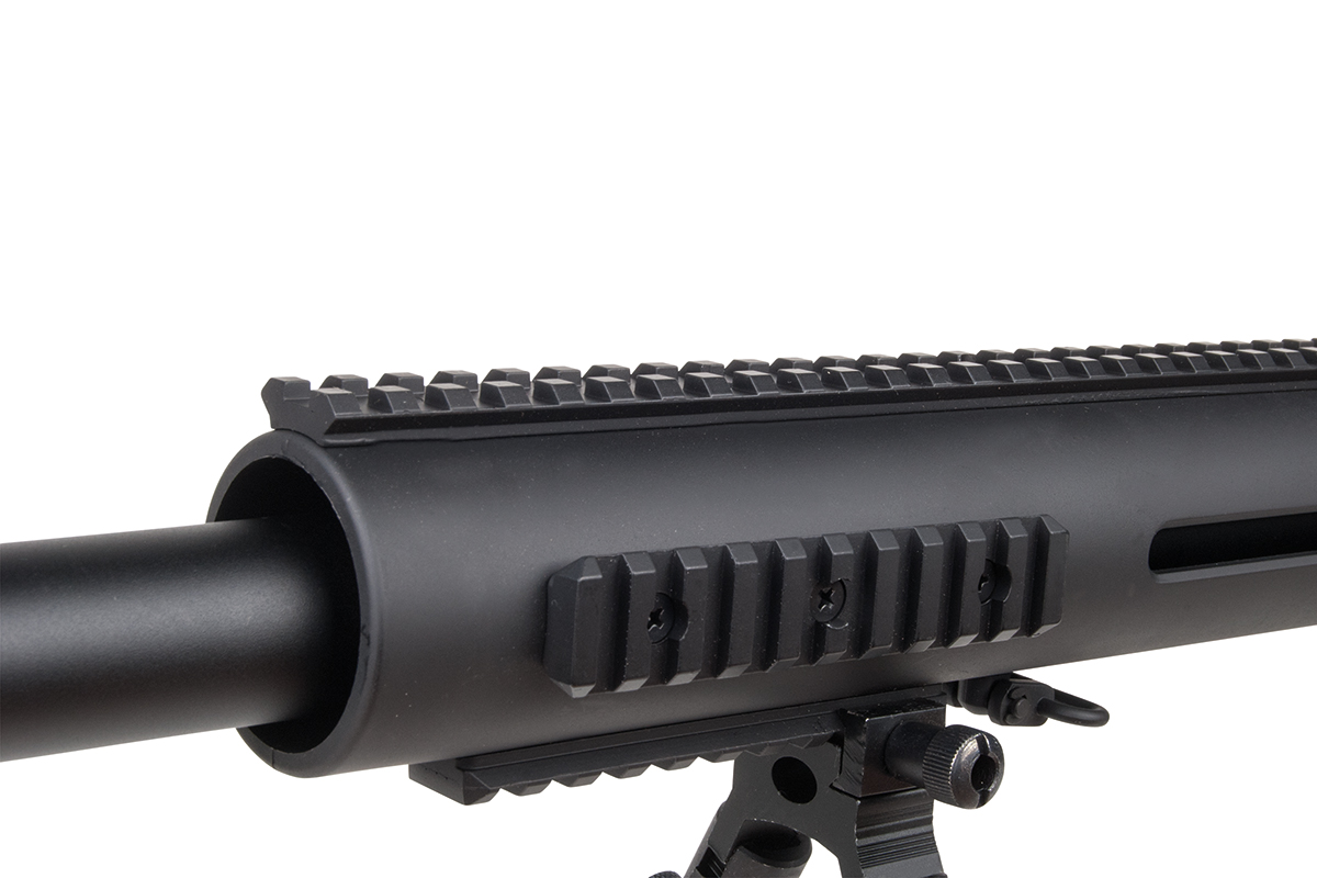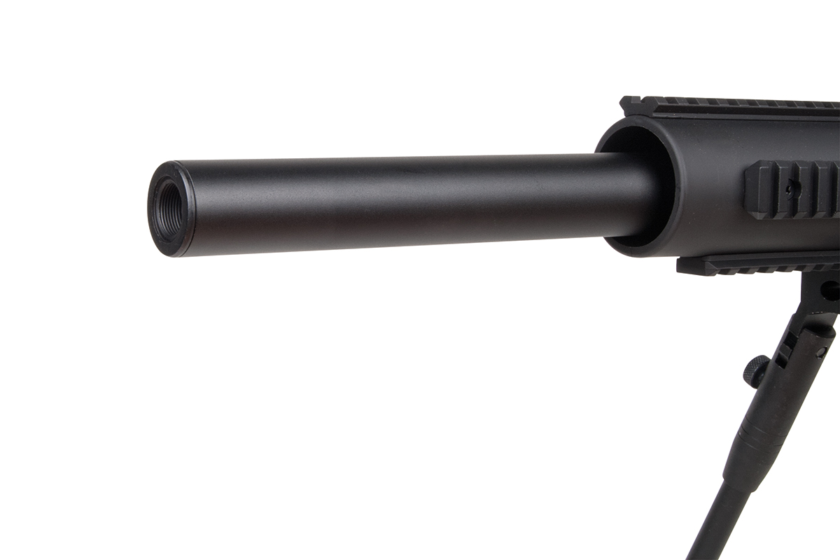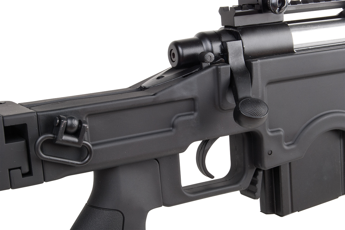 Das hochwertige Sniper-Gewehr aus dem Hause WELL mit einer Energie von ca. 1,7 Joule verfügt über eine einklappbare Schulterstütze, ein integriertes Zweibein, einen Tragegurt, einen Speedloader, eine höhenverstellbare Wangenauflage und verschiedene Railschienen. Gefertigt wird das Mododell aus Metall (Hauptgehäuse, Lauf & R.I.S.-System) sowie aus Kunststoff. Das bewährte Spin-Up System sorgt für Präzision auf höchstem Niveau. Die Lieferung erfolgt inklusive passendem Zielfernrohr.