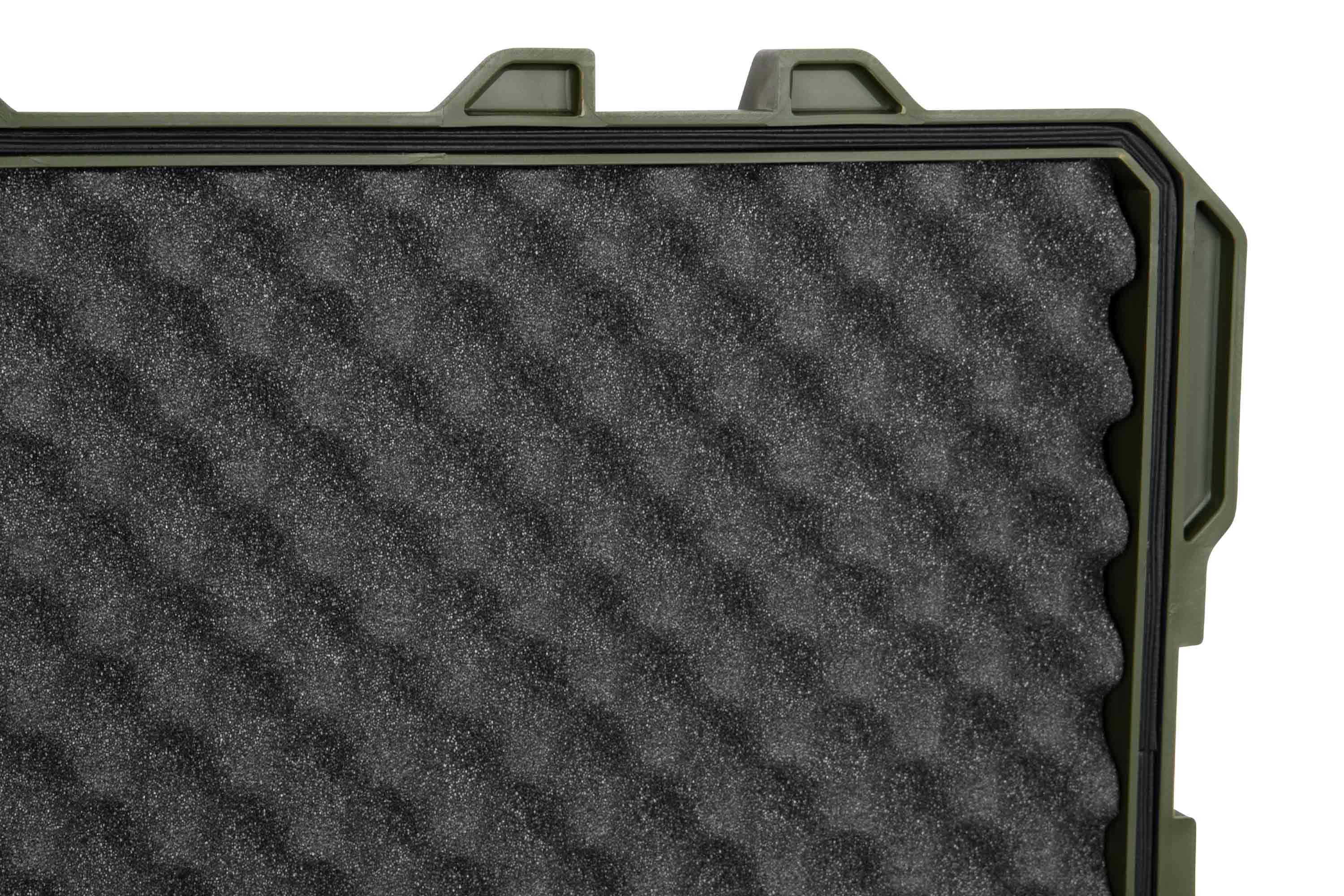 Im Inneren befindet sich ein weiches Schaumstoffinlay. Auf der Oberseite im Eggshell-Design und in der Unterseite ein Pick-n-Plug-Design. Bei letzterem können die vorgeritzen kleinen Quadrate einfach entnommen werden um den Koffer perfekt an die jeweiligen Bedürfnisse anzupassen. Die zwei durchgehenden Löcher an beiden Enden ermöglichen die sichere Abriegelung mit einem Schloss, Kabelbindern etc.