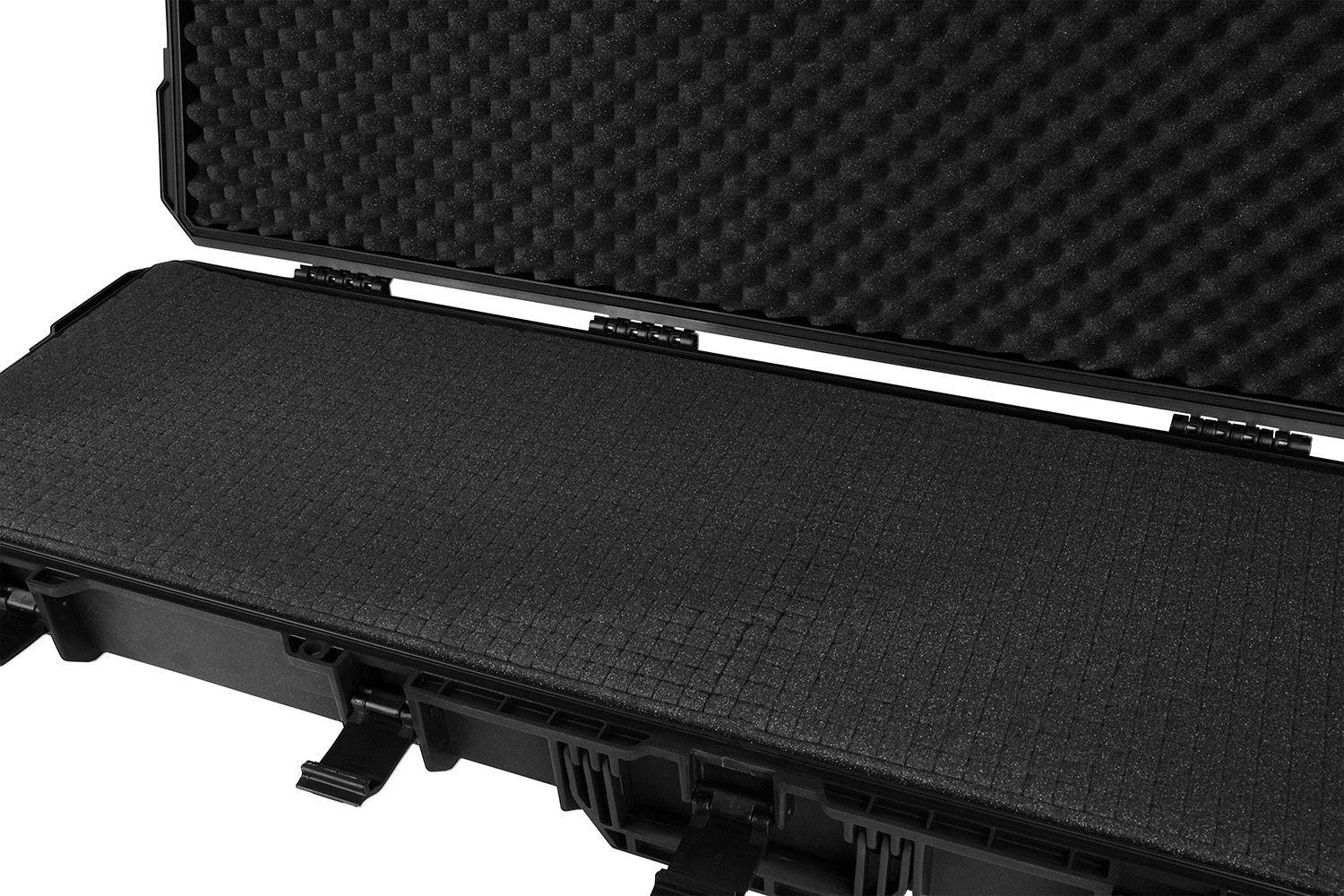 Im Inneren befindet sich ein weiches Schaumstoffinlay. Auf der Oberseite im Eggshell-Design und in der Unterseite ein Pick-n-Plug-Design. Bei letzterem können die vorgeritzen kleinen Quadrate einfach entnommen werden um den Koffer perfekt an die jeweiligen Bedürfnisse anzupassen. Die zwei durchgehenden Löcher an beiden Enden ermöglichen die sichere Abriegelung mit einem Schloss, Kabelbindern etc.