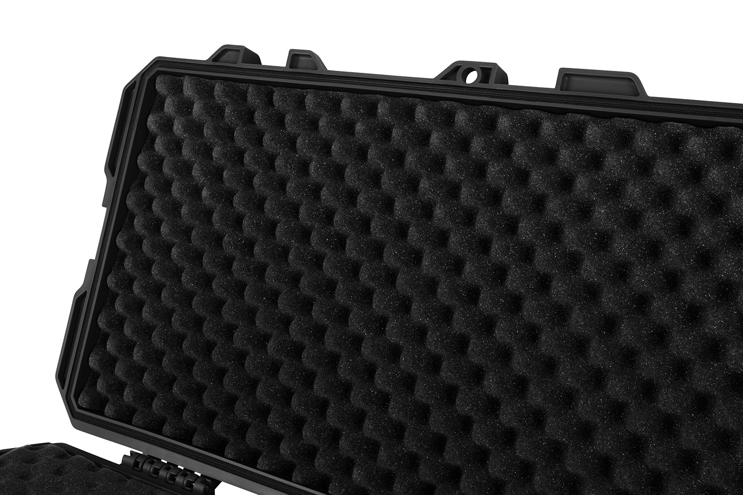 Im Inneren befindet sich ein weiches Schaumstoffinlay. Auf der Oberseite im Eggshell-Design und in der Unterseite ein Pick-n-Plug-Design. Bei letzterem können die vorgeritzen kleinen Quadrate einfach entnommen werden um den Koffer perfekt an die jeweiligen Bedürfnisse anzupassen. Die zwei durchgehenden Löcher an beiden Enden ermöglichen die sichere Abriegelung mit einem Schloss, Kabelbindern etc.