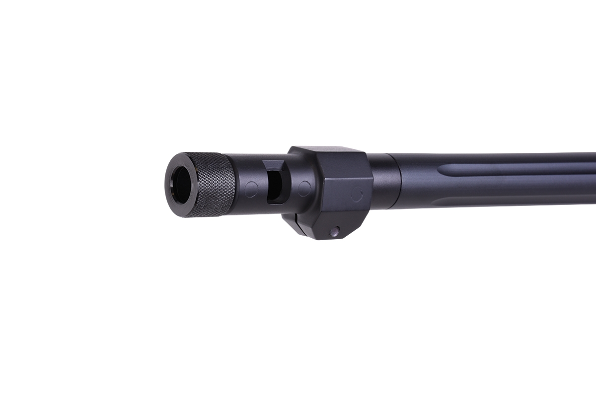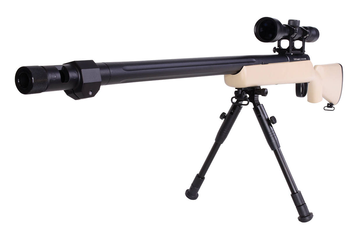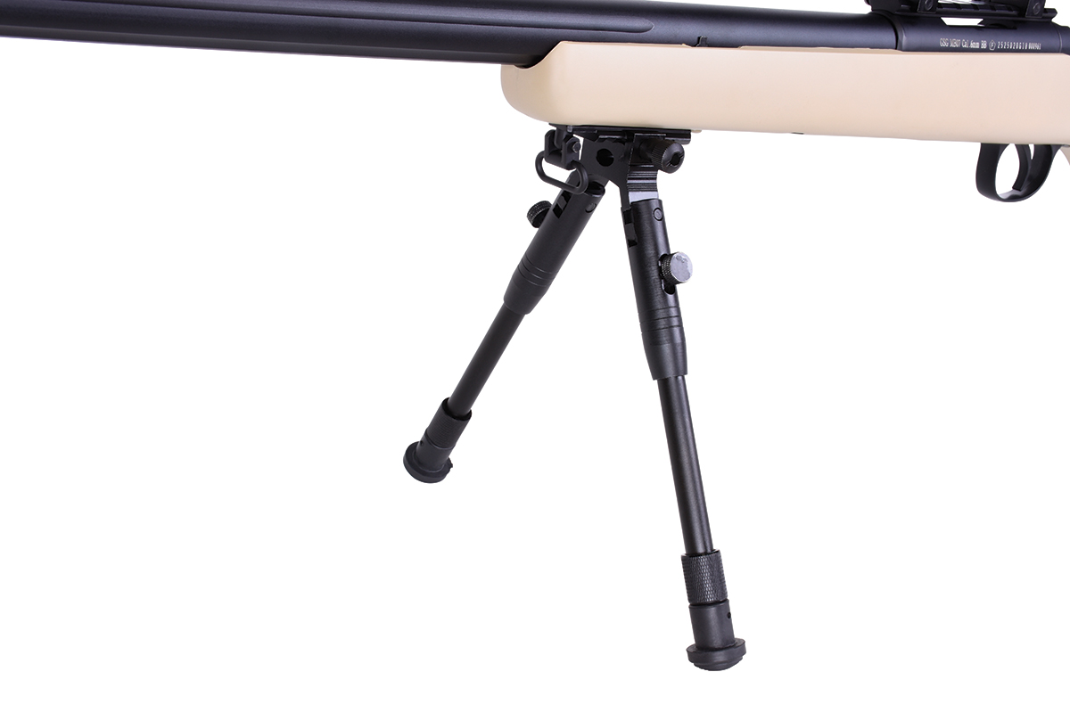 Der sehr gelungene Nachbau mit Federdrucksystem und einer Energie von ca. 1,8 Joule wird inkl. Zielfernrohr geliefert und verfügt über einen Außenlauf im Fluted-Barrel-Design, einen abnehmbaren Flash-Hider (18mm-Rechtsgewinde), ein Metall-Zweibein, Montageschienen und das bewährte Spin-Up System für Präzision auf höchstem Niveau. Schaft und Magazin werden aus hochwertigem Kunststoff gefertigt, Außenlauf, Upper Receiver, Abzugseinheit, Zylinder und Zweibein bestehen aus Metall. Das mitgelieferte federgelagerte Zweibein ist klapp- sowie höhenverstellbar und verfügt über gummierte Füße für einen sicheren Stand. Im Lieferumfang sind außerdem ein Speedloader und ein Tragegurt enthalten.