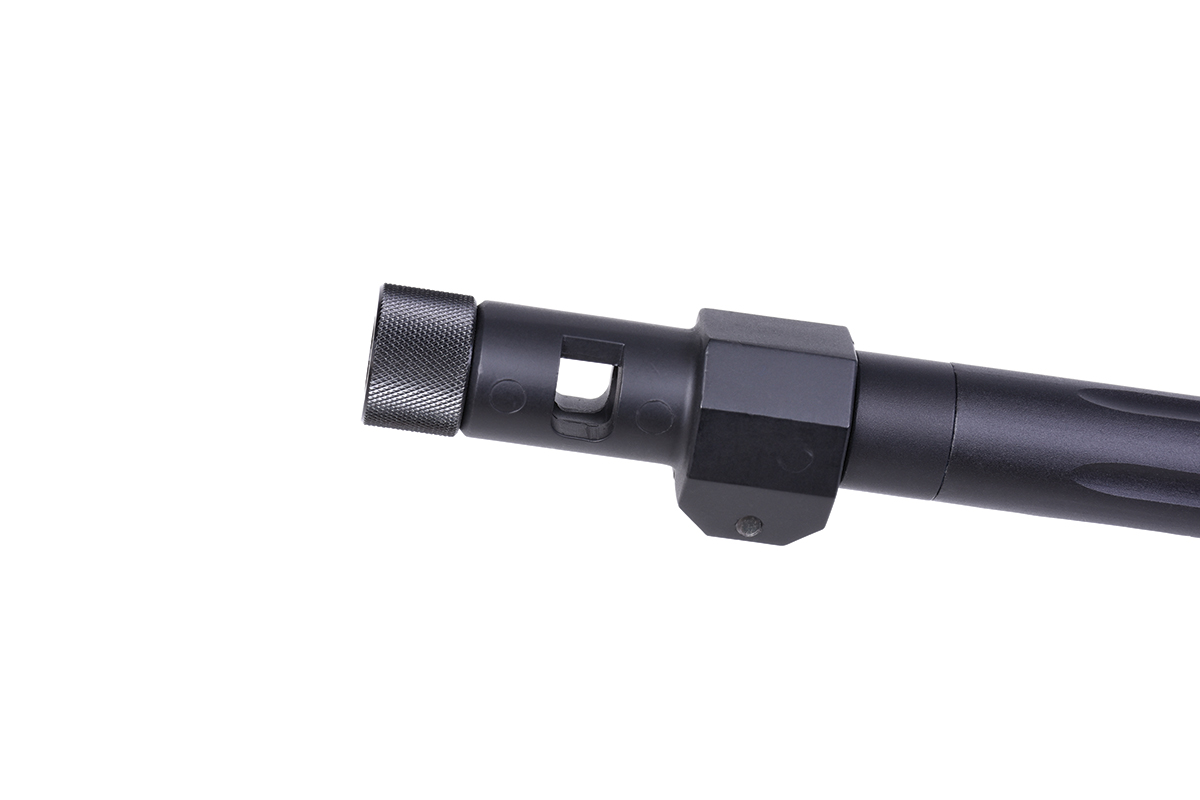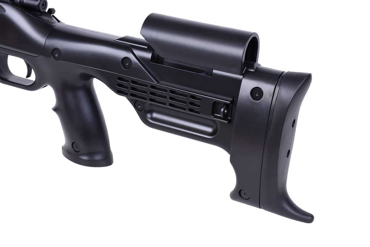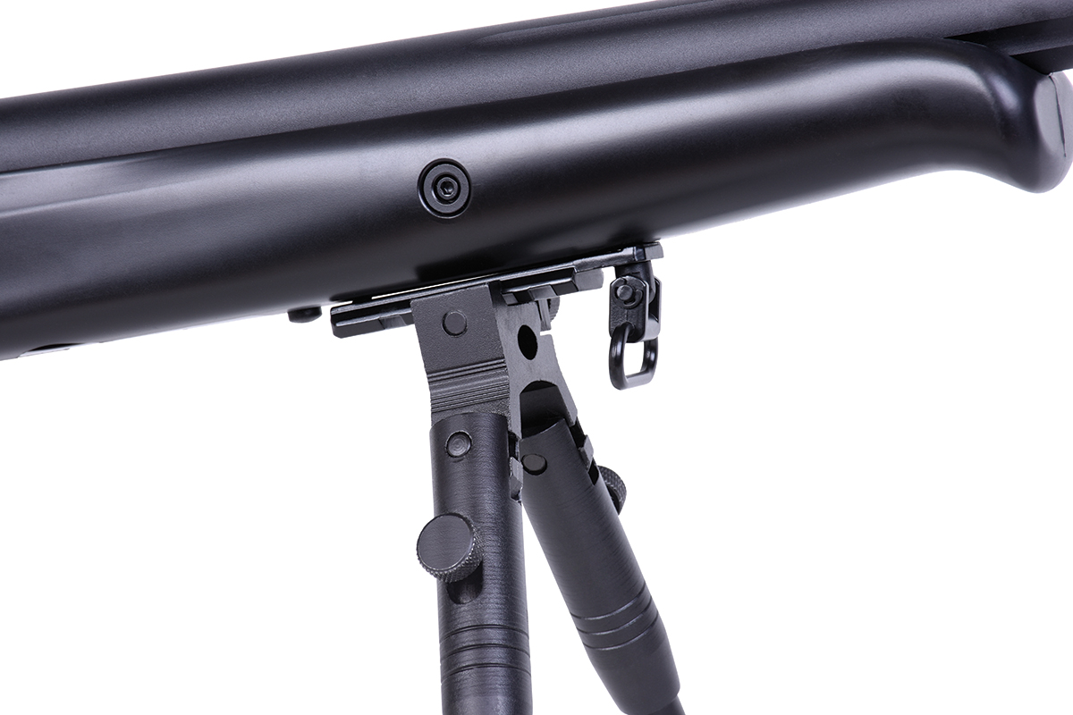 Der sehr gelungene Nachbau mit Federdrucksystem und einer Energie von ca. 2,0 Joule wird inkl. Zielfernrohr geliefert und verfügt über eine stufenlos verstellbare Wangenauflage, eine gummierte Schaftkappe, einen Außenlauf im Fluted-Barrel-Design, einen abnehmbaren Flash-Hider (18mm-Rechtsgewinde), ein Metall-Zweibein, Montageschienen und das bewährte Spin-Up System für Präzision auf höchstem Niveau. Schaft und Magazin werden aus hochwertigem Kunststoff gefertigt, Außenlauf, Upper Receiver, Abzugseinheit, Zylinder und Zweibein bestehen aus Metall. Das mitgelieferte federgelagerte Zweibein ist klapp- sowie höhenverstellbar und verfügt über gummierte Füße für einen sicheren Stand. Im Lieferumfang sind außerdem ein Speedloader und ein Tragegurt enthalten.