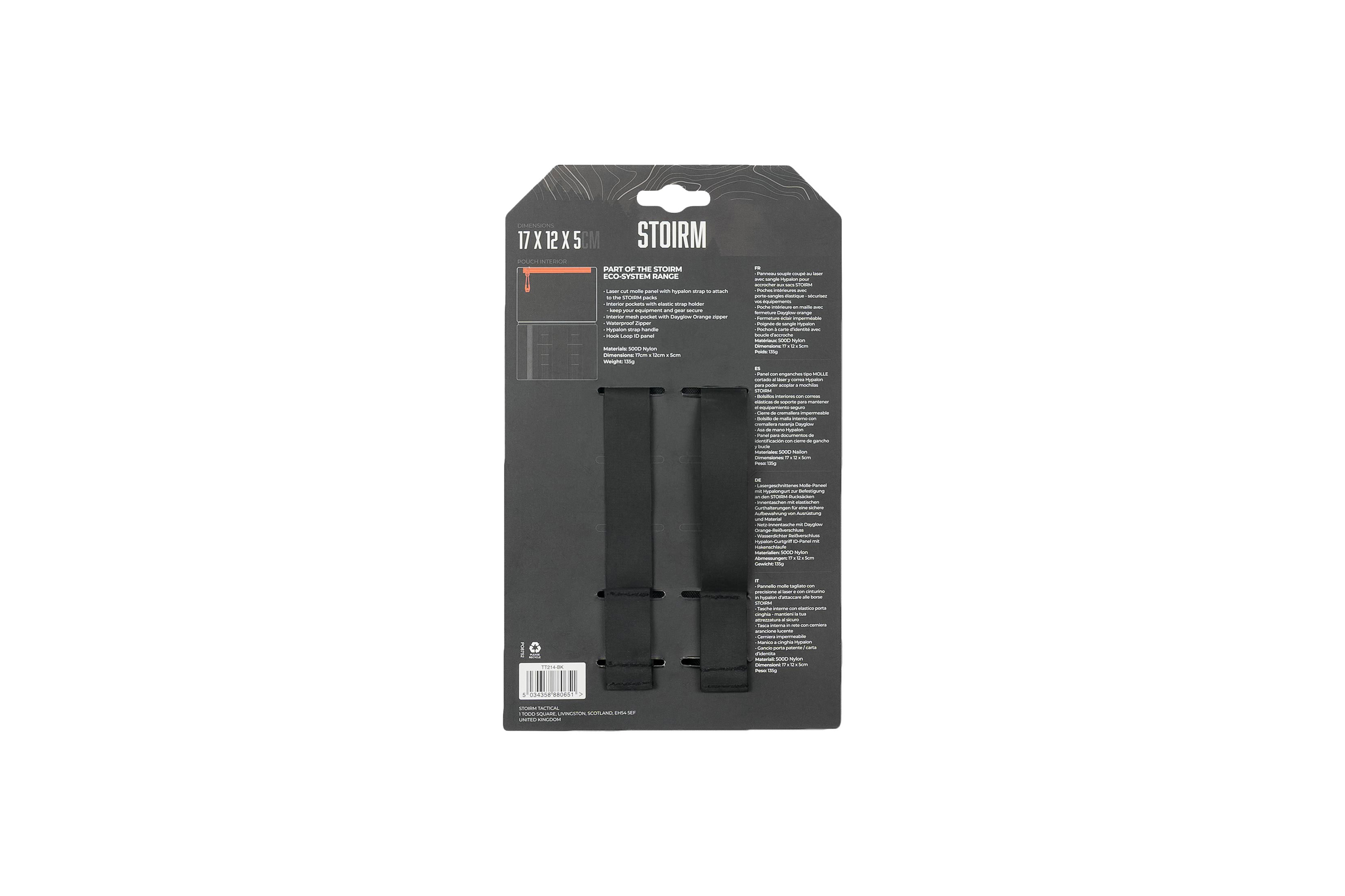 Dank Laser-Cut-MOLLE-System und Hypalon-Befestigungsriemen kann die Pouch flexibel angebracht und im Rahmen des STOIRM Eco-Systems individuell positioniert werden. Eine Klettfläche auf der Vorderseite ermöglicht zudem die Anbringung von Patches.