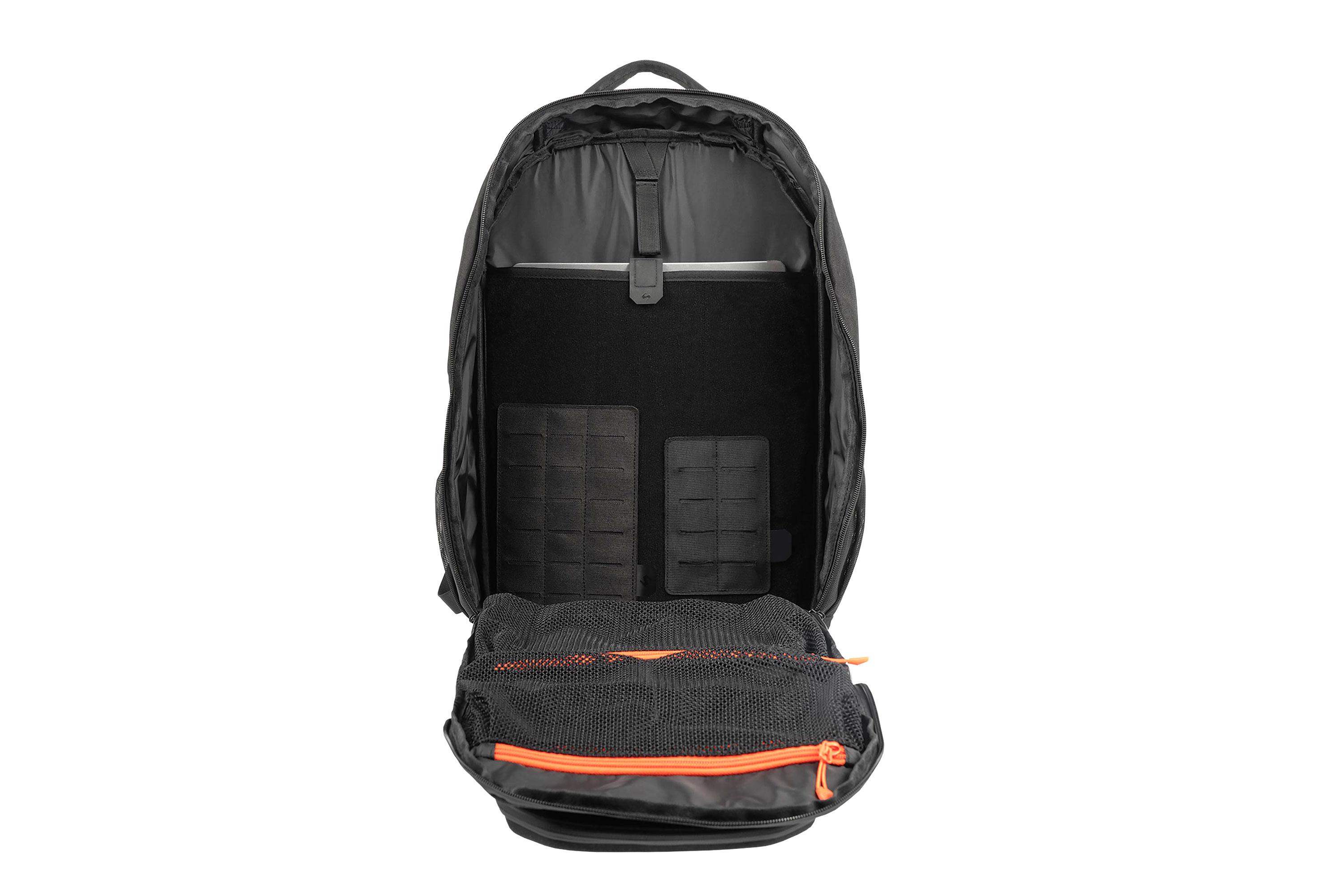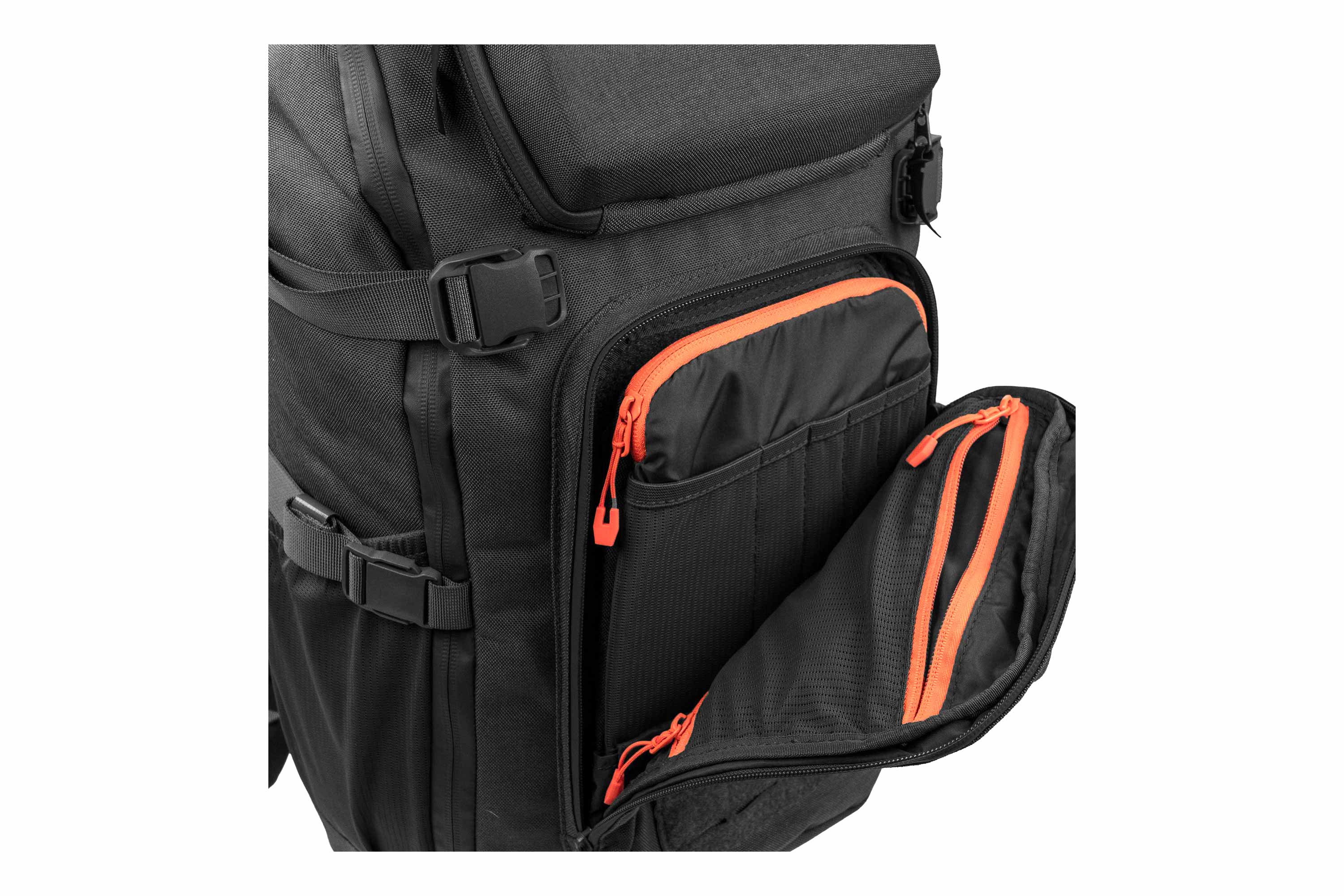 Auch das Frontfach lässt sich weit öffnen und bietet zusätzliche Organisationsmöglichkeiten. Zwei innenliegende Mesh-Reißverschlusstaschen sowie ein herausnehmbares Organizer-Panel helfen dabei, kleinere Ausrüstungsgegenstände übersichtlich zu verstauen.