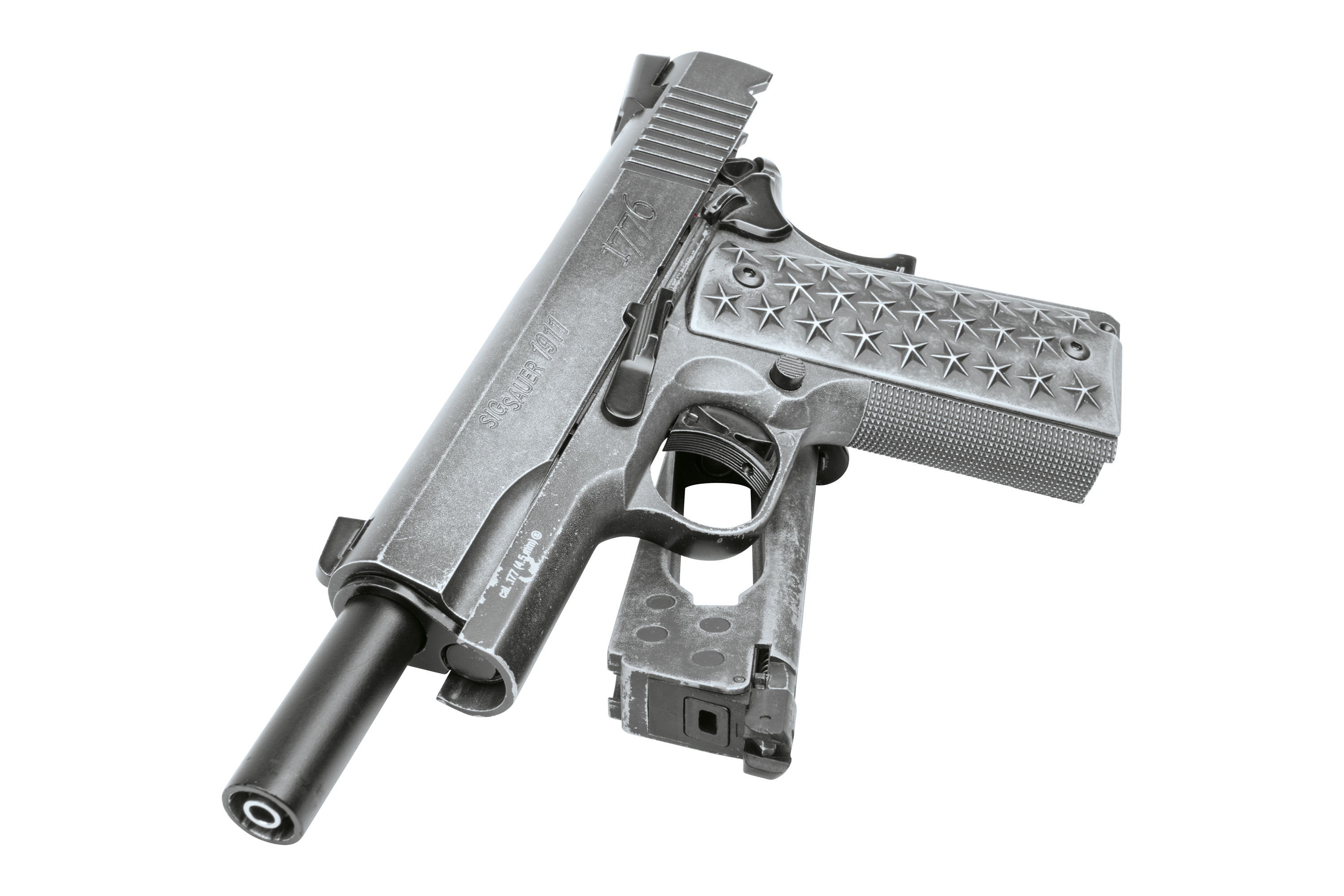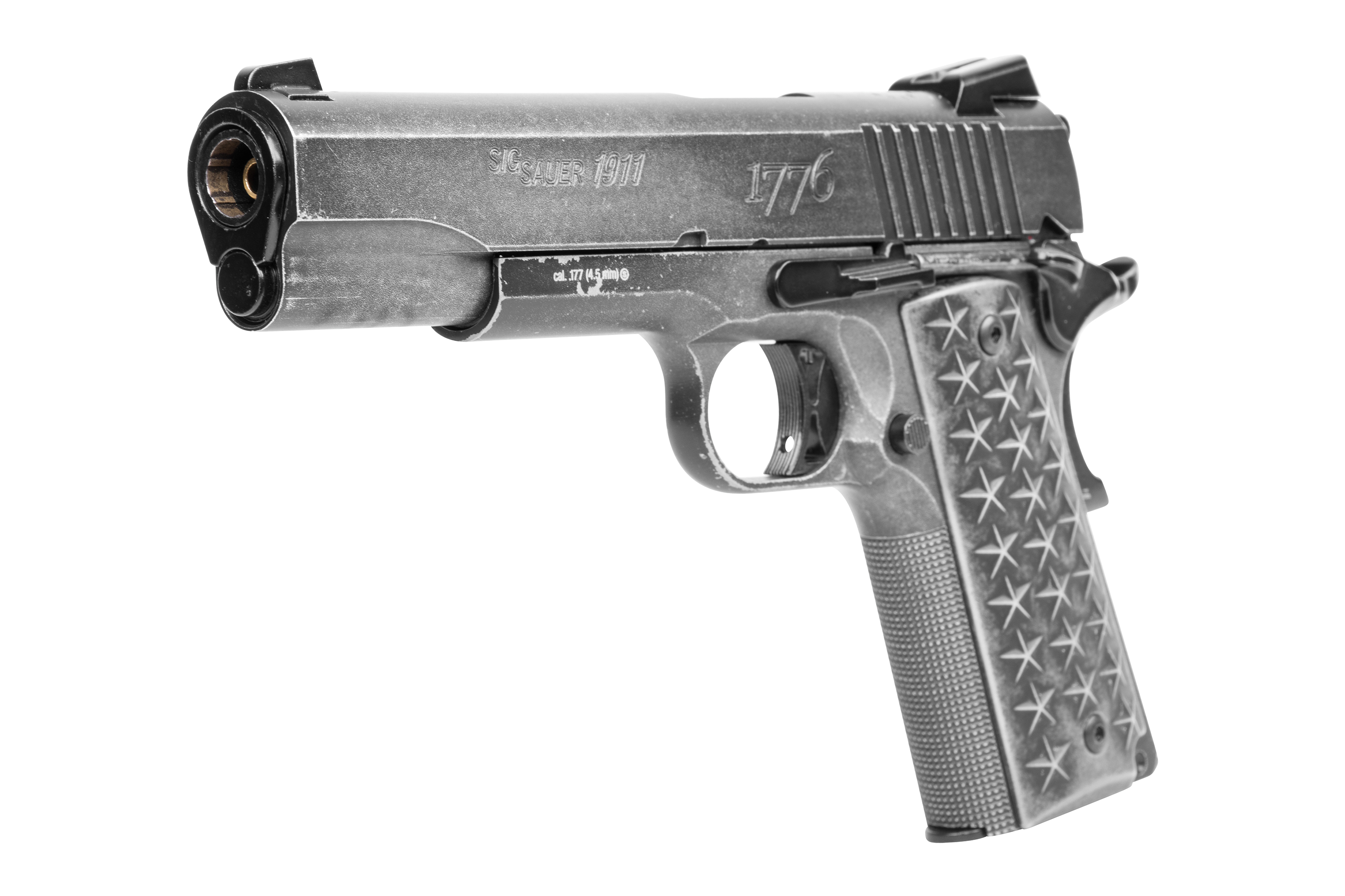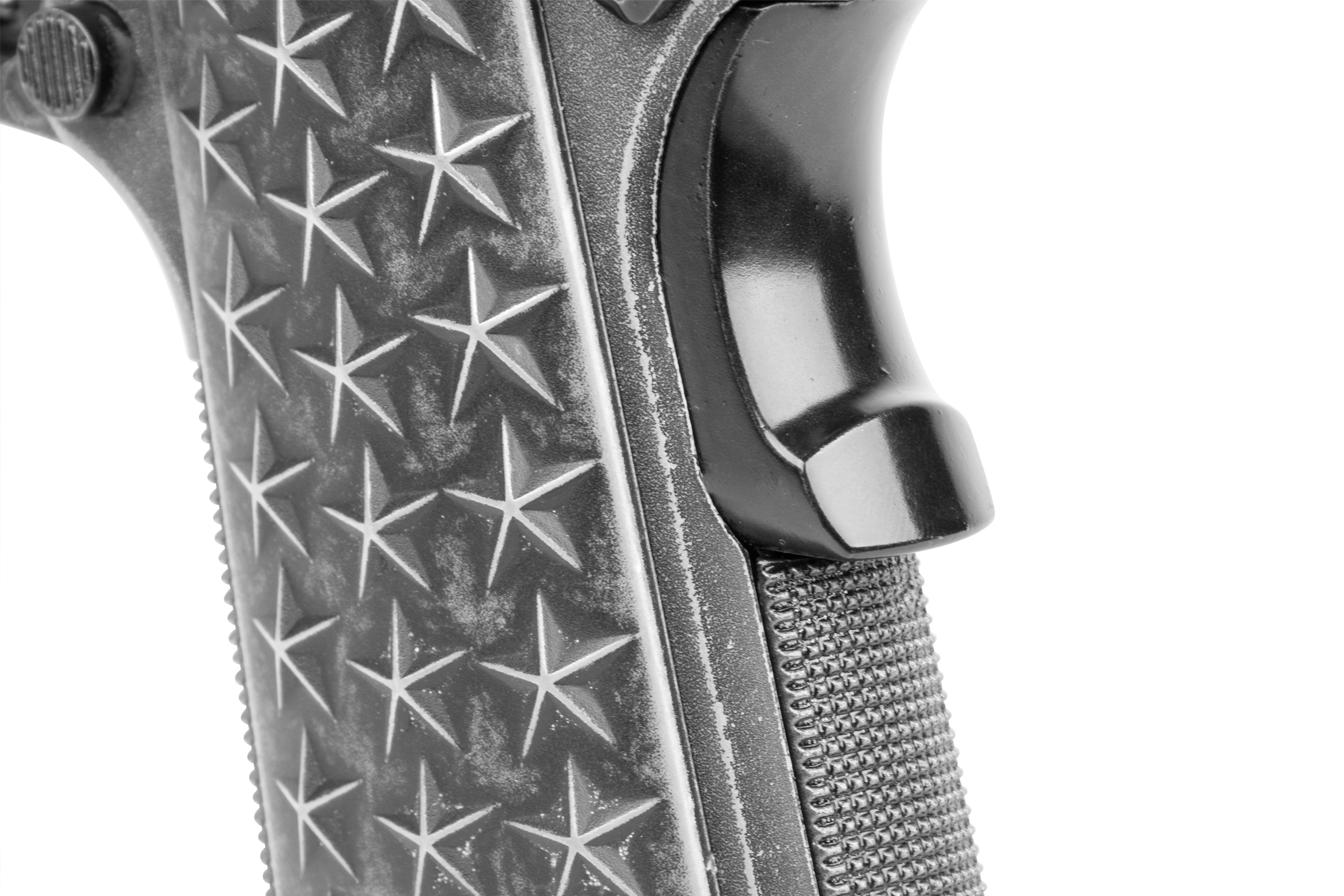 Inspiriert von der außergewöhnlich populären 1911 verfügt die BB-Pistolenversion dieser einzigartigen amerikanischen Pistole über Griffschalen mit 50 Sternen (25 pro Seite), welche die Staaten der Union repräsentieren. Der Edelstahl-Schlitten und das Griffstück wurden mit einem Distressed-Finish veredelt.