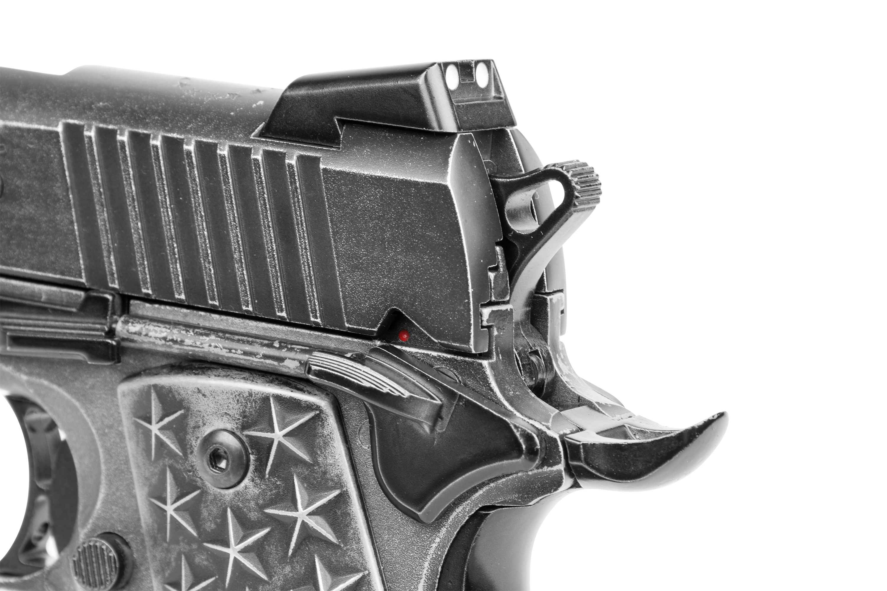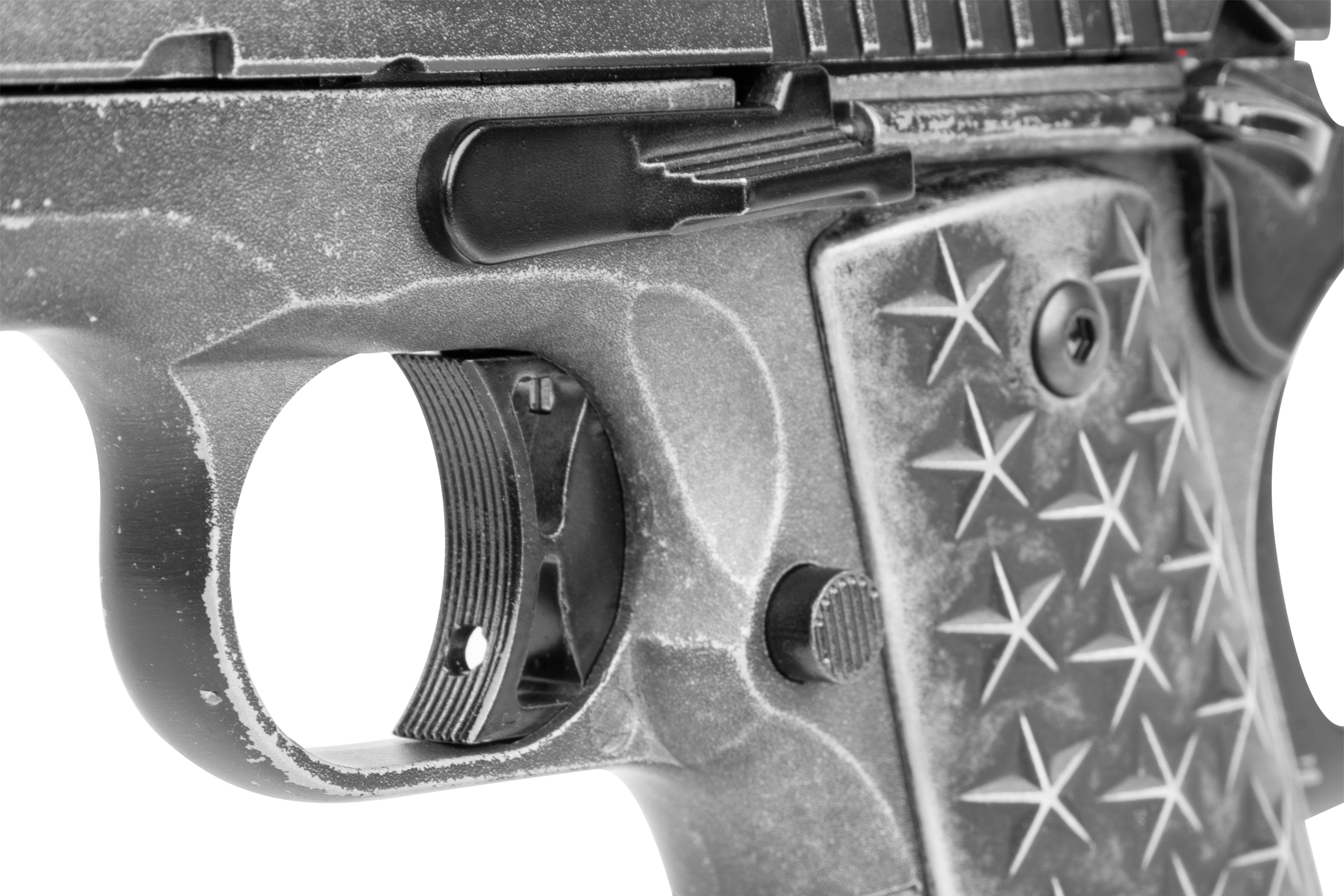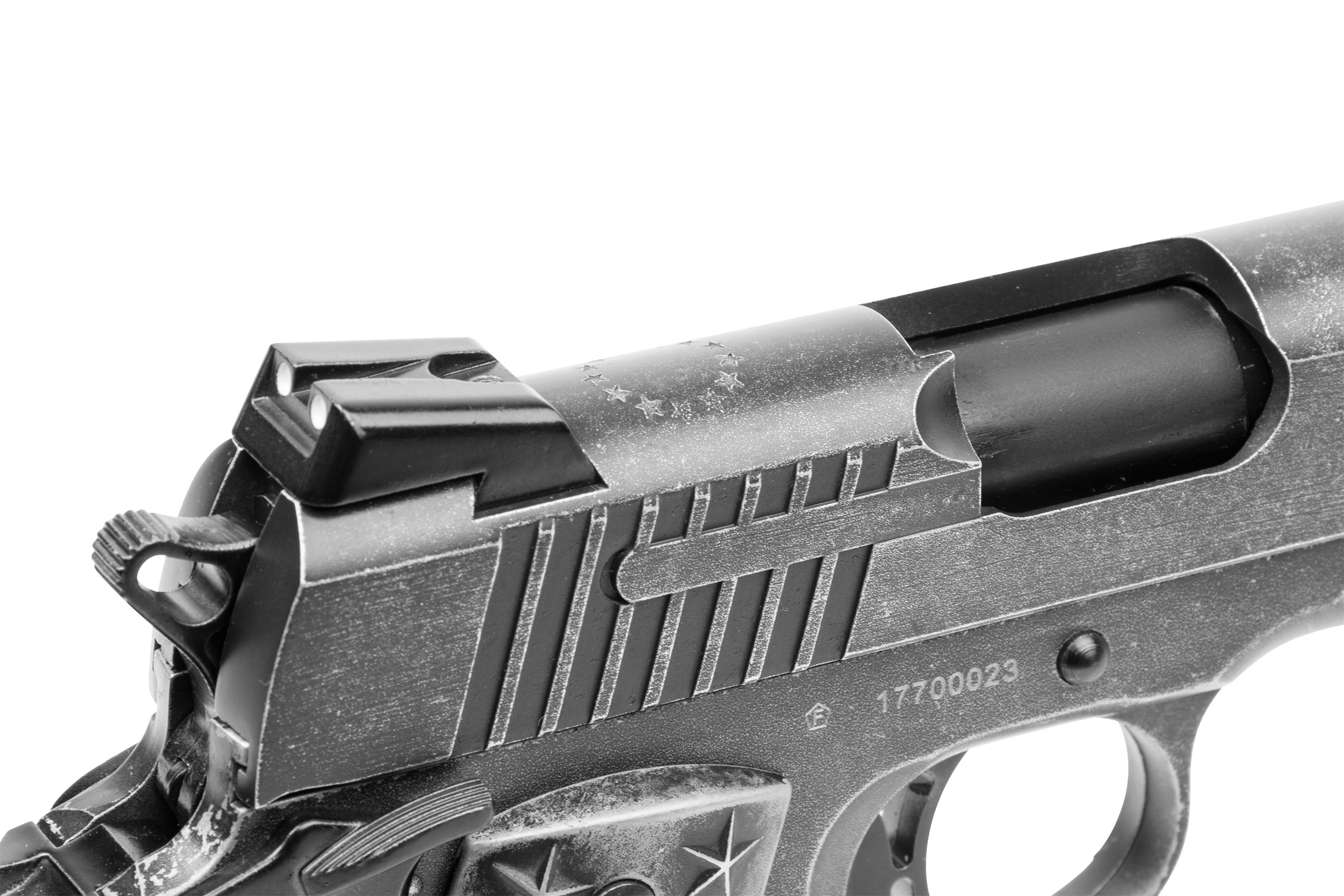 Inspiriert von der außergewöhnlich populären 1911 verfügt die BB-Pistolenversion dieser einzigartigen amerikanischen Pistole über Griffschalen mit 50 Sternen (25 pro Seite), welche die Staaten der Union repräsentieren. Der Edelstahl-Schlitten und das Griffstück wurden mit einem Distressed-Finish veredelt.