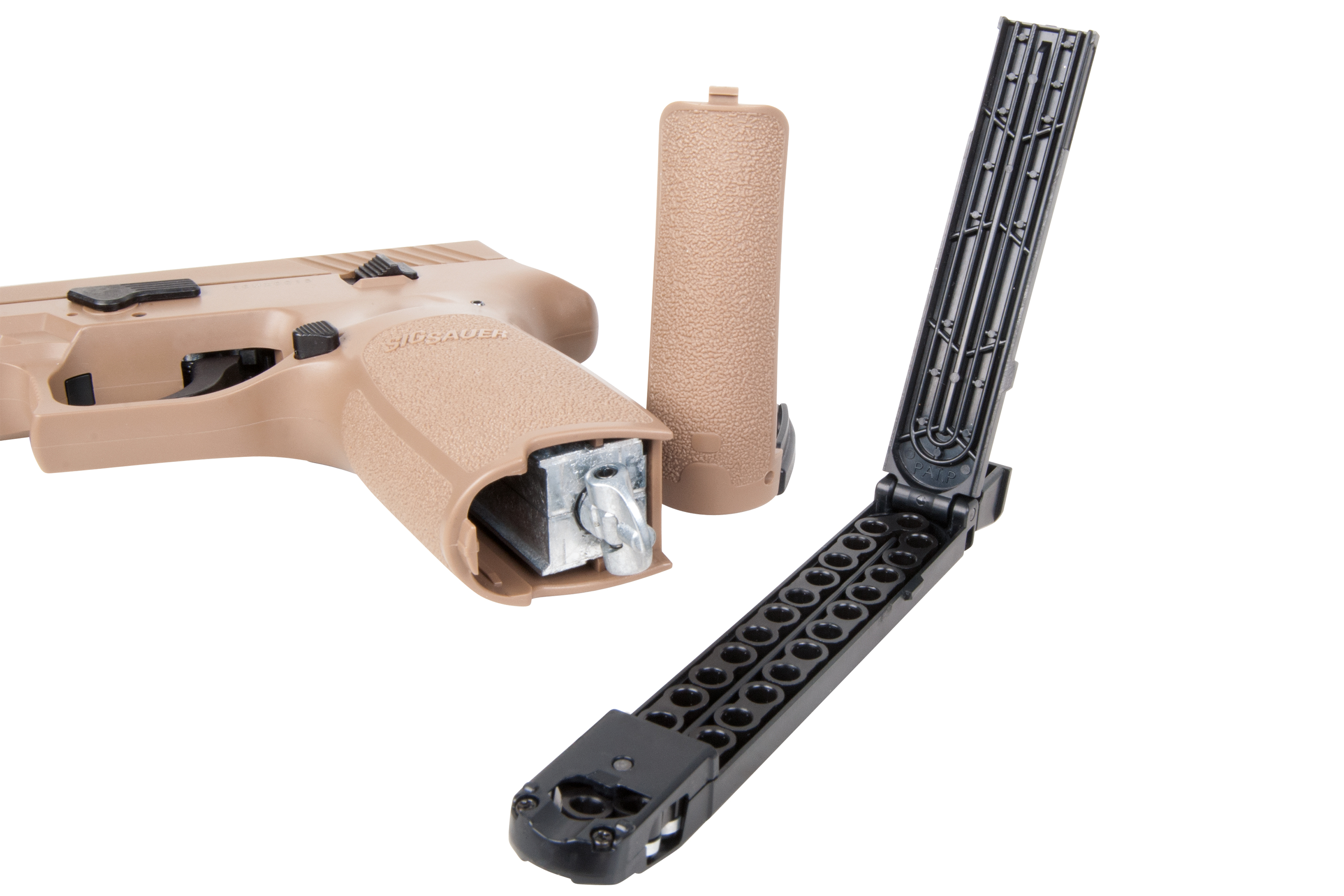 Die Replika der P320 ist die erste Pistole auf dem Markt, die dank des innovativen 30 Schuss RPM-Kettenmagazins (Rapid Pellet Magazin), sowohl Diabolos als auch 4,5 mm BBs verschießen kann. Allerdings empfehlen wir nur das Schießen mit Diabolos, denn die BBs können zu Schäden im Lauf führen. Das patentierte Antriebssystem des RPM führt in 3,5 Sekunden problemlos bis zu 30 Schuss zu. Sie wird mit einer CO2 Kapsel betrieben, die im Griffstück untergebracht wird. Ein einfacher CO2-Anstich ist ohne weiteres Werkzeug möglich, denn die Kapsel wird angestochen, wenn du die Schraube des Griffstücks festziehst.